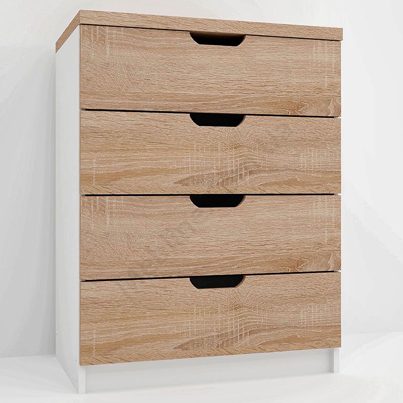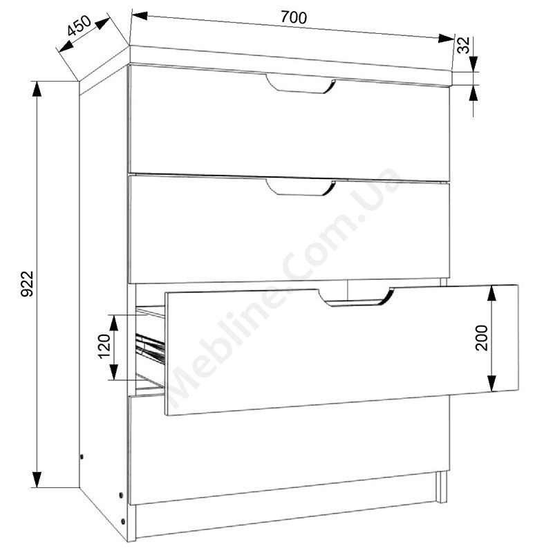 Виконаний з ламінованої ДСП Swiss Krono, завтовшки 16 мм.ДСП має високу щільність.Екологічна безпека класу Е-1.Кромка — протиударна ПВХ, завтовшки 0, 5 мм.Фурнітура — DC та Linken.Чотири висувні шухляди.Шухляди на телескопічних напрямних, глибиною 400 мм.Замість ручок вирізи у фасадах.