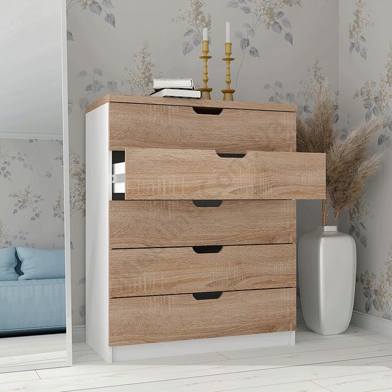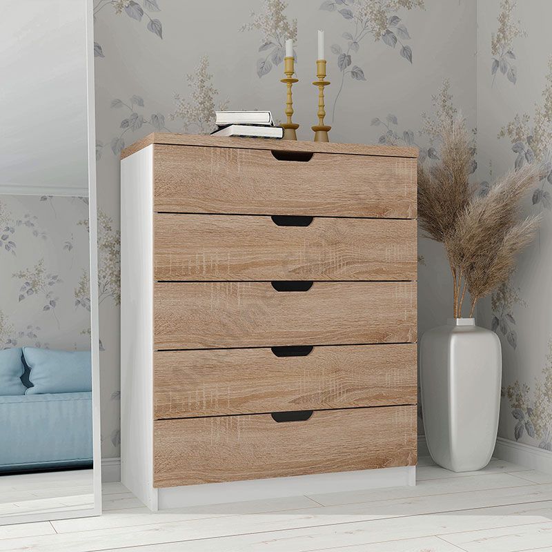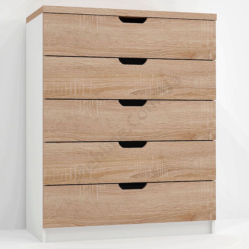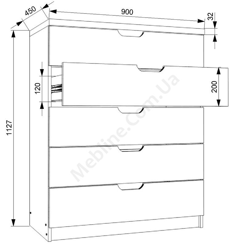 Виконаний з ламінованої ДСП Swiss Krono, завтовшки 16 мм.ДСП має високу щільність.Екологічна безпека класу Е-1.Кромка — протиударна ПВХ, завтовшки 0, 5 мм.Фурнітура — DC та Linken.П’ять висувних шухляд.Шухляди на телескопічних напрямних, глибиною 400 мм.Замість ручок вирізи у фасадах.