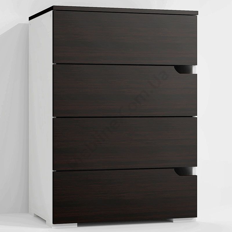 Виконаний з ламінованої ДСП Swiss Krono, завтовшки 16 мм.ДСП має високу щільність.Екологічна безпека класу Е-1.Кромка — протиударна ПВХ, завтовшки 0, 5 мм.Фурнітура — DC та Linken.Чотири висувні шухляди.Шухляди на телескопічних напрямних, глибиною 400 мм.Замість ручок вирізи у фасадах.