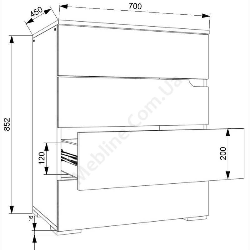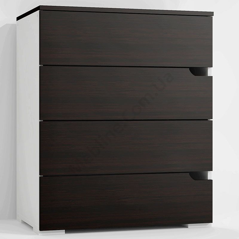 Виконаний з ламінованої ДСП Swiss Krono, завтовшки 16 мм.ДСП має високу щільність.Екологічна безпека класу Е-1.Кромка — протиударна ПВХ, завтовшки 0, 5 мм.Фурнітура — DC та Linken.Чотири висувні шухляди.Шухляди на телескопічних напрямних, глибиною 400 мм.Замість ручок вирізи у фасадах.
