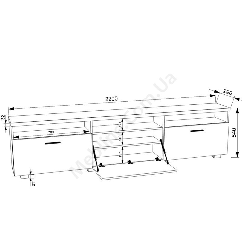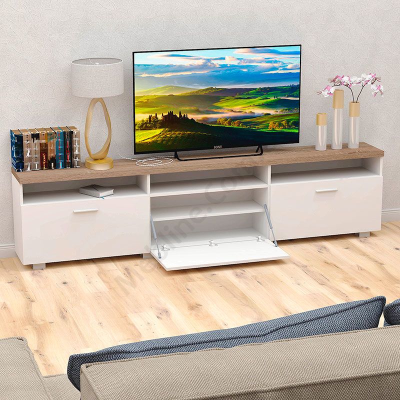 Тумба під телевізор з відкидними дверцятами та відкритими полицями.
