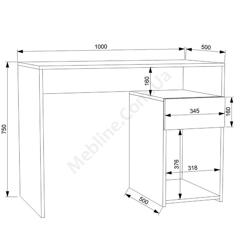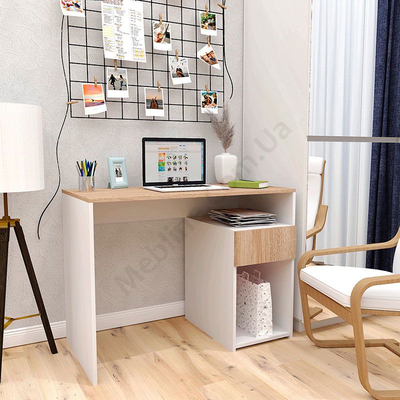 Комп’ютерний стіл з відкритими полицями та шухлядою.