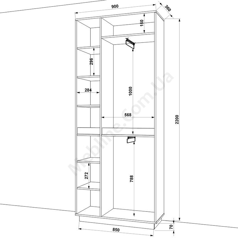 Матеріал — ламінована ДСП Swiss Krono, завтовшки 16 мм.Екологічна безпека класу Е-1.ДСП має високу щільність.Фурнітура — DC та Linken.Протиударна кромка — ПВХ, завтовшки 1 мм.Регульовані опори 70 мм.Шість розпашних дверцят.За верхніми лівими дверцятами чотири секції, за нижніми лівими — три.За верхніми правими дверцятами мікроліфт з верхньою полицею, за нижніми — мікроліфт.