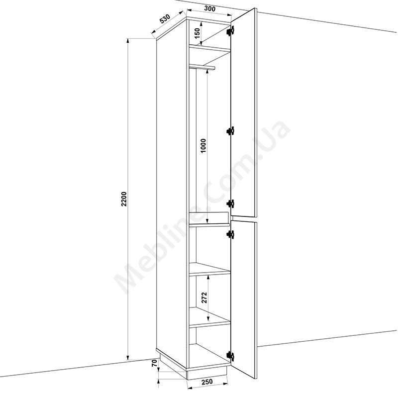 Матеріал — ламінована ДСП Swiss Krono, завтовшки 16 мм.Екологічна безпека класу Е-1.ДСП має високу щільність.Фурнітура — DC та Linken.Протиударна кромка — ПВХ, завтовшки 1 мм.Регульовані опори 70 мм.Дві розпашні двері.За верхніми дверцятами штанга для одягу та верхня полиця.За нижніми дверцятами три секції.