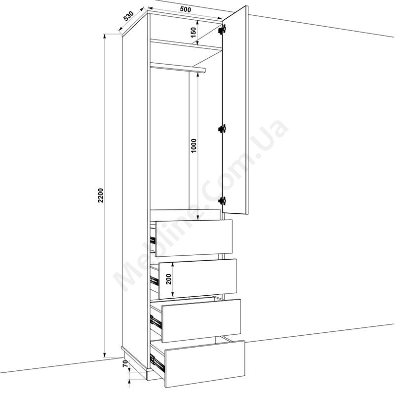 Матеріал — ламінована ДСП Swiss Krono, завтовшки 16 мм.Екологічна безпека класу Е-1.ДСП має високу щільність.Фурнітура — DC та Linken.Протиударна кромка — ПВХ, завтовшки 1 мм.Регульовані опори 70 мм.Одні розпашні дверцята.За дверцятами штанга для одягу та верхня полиця.Знизу чотири висувні шухляди.
