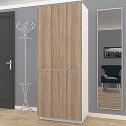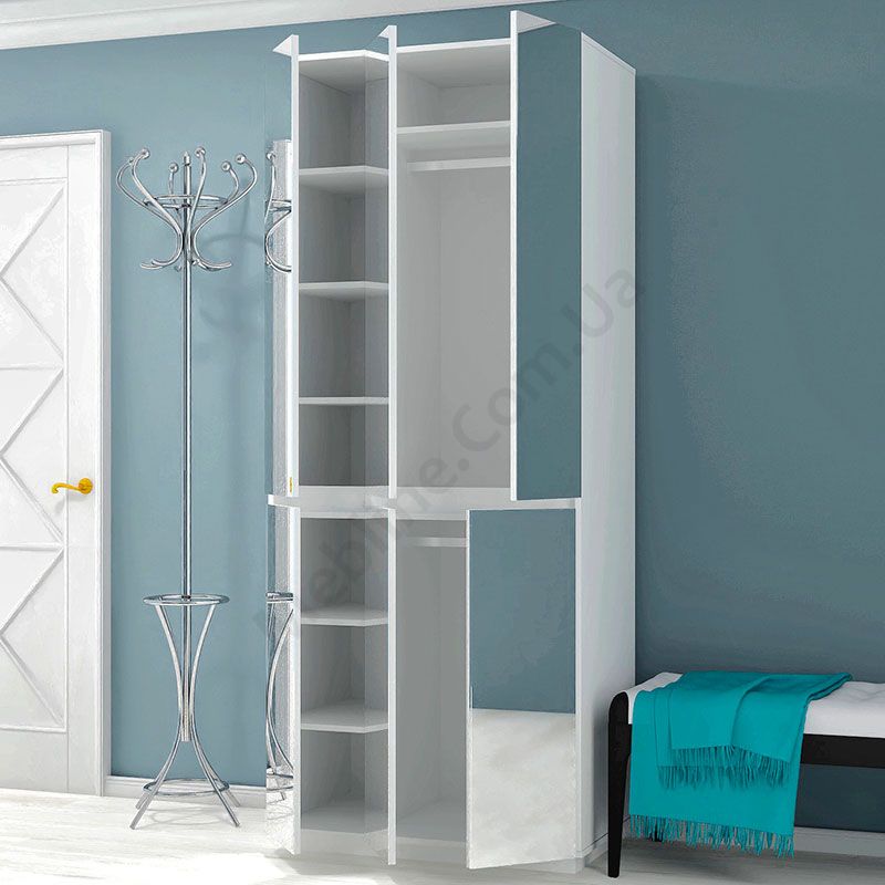 Матеріал — ламінована ДСП Swiss Krono, завтовшки 16 мм.Екологічна безпека класу Е-1.ДСП має високу щільність.Фурнітура — DC та Linken.Протиударна кромка — ПВХ, завтовшки 1 мм.Регульовані опори 70 мм.Шість розпашних дверцят.За верхніми лівими дверцятами чотири секції, за нижніми лівими — три.За верхніми правими дверцятами штанга для одягу з верхньою полицею, за нижніми — штанга для одягу.