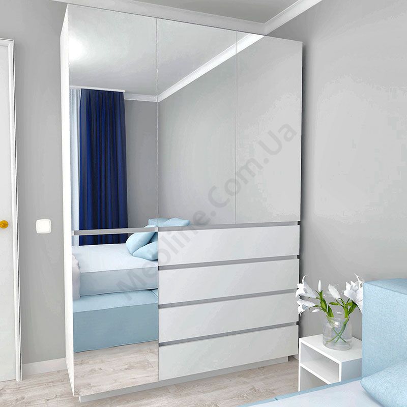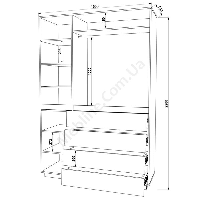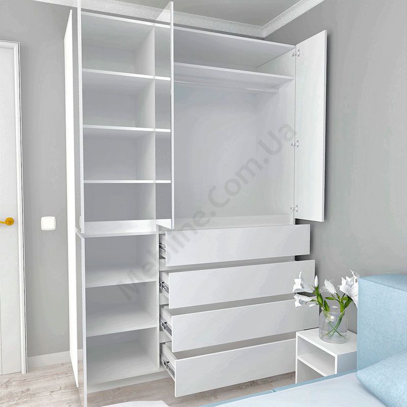 Матеріал — ламінована ДСП Swiss Krono, завтовшки 16 мм.Екологічна безпека класу Е-1.ДСП має високу щільність.Фурнітура — DC та Linken.Протиударна кромка — ПВХ, завтовшки 1 мм.Регульовані опори 70 мм.Чотири розпашні двері.За верхніми лівими дверцятами чотири секції, за нижніми лівими — три.За правими дверцятами штанга для одягу з верхньою полицею.Знизу чотири висувні шухляди.