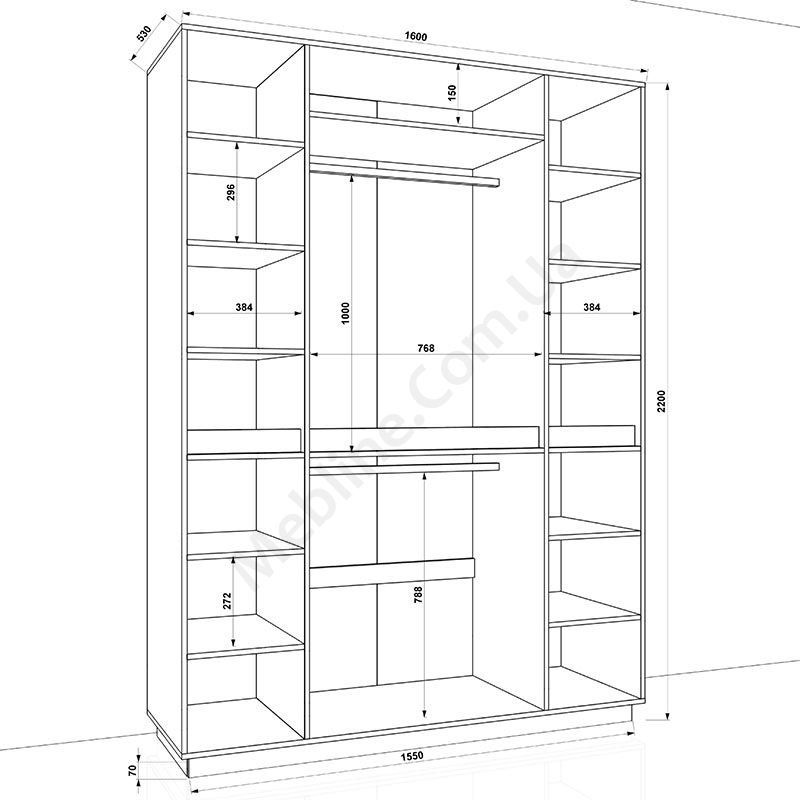 Матеріал — ламінована ДСП Swiss Krono, завтовшки 16 мм.Екологічна безпека класу Е-1.ДСП має високу щільність.Фурнітура — DC та Linken.Протиударна кромка — ПВХ, завтовшки 1 мм.Регульовані опори 70 мм.Вісім розпашних дверцят.За верхніми крайніми дверцятами по чотири секції, за нижніми крайніми — по три.За верхніми середніми дверцятами штанга для одягу з верхньою полицею, за нижніми — штанга для одягу.
