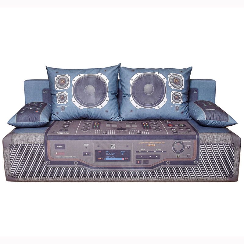 Розкладний диван з м’якими подушками.