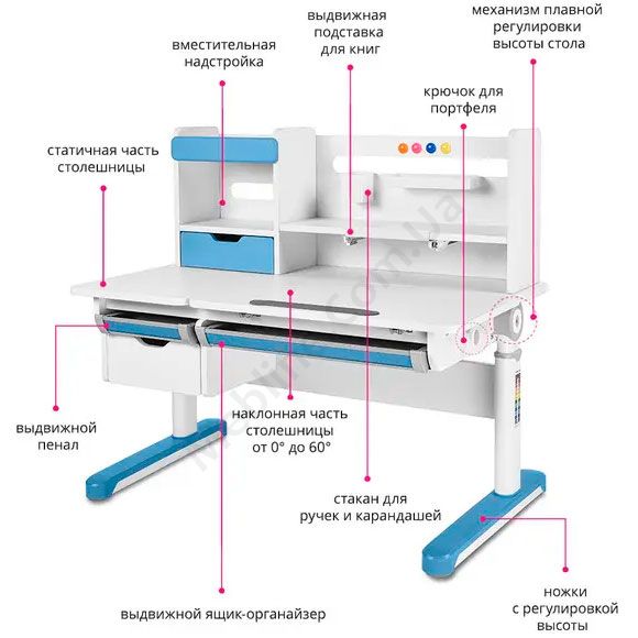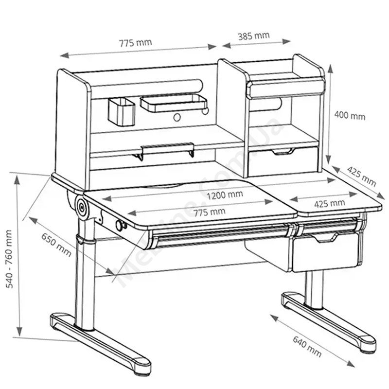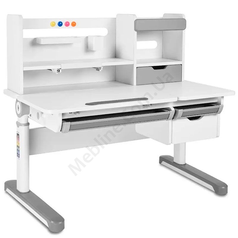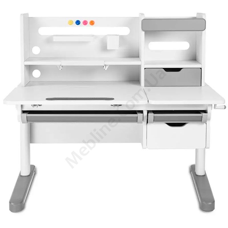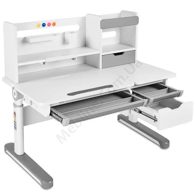 Зростаюча парта біло-сірого кольору з шухлядами, надставкою та регулюванням висоти.