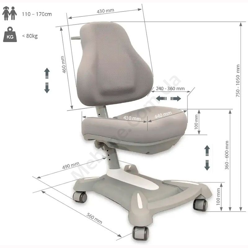 Ортопедичне крісло для школяра сірого кольору з підлокітниками.