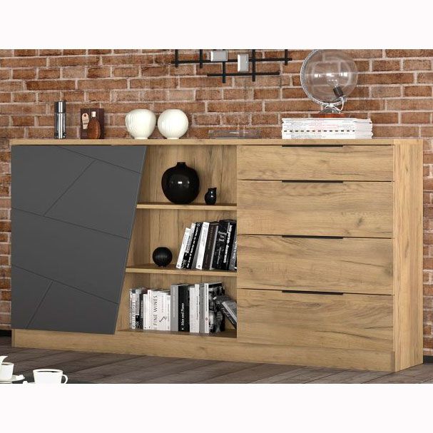 Комод з висувними шухлядами, відкритими полицями та дверцятами.