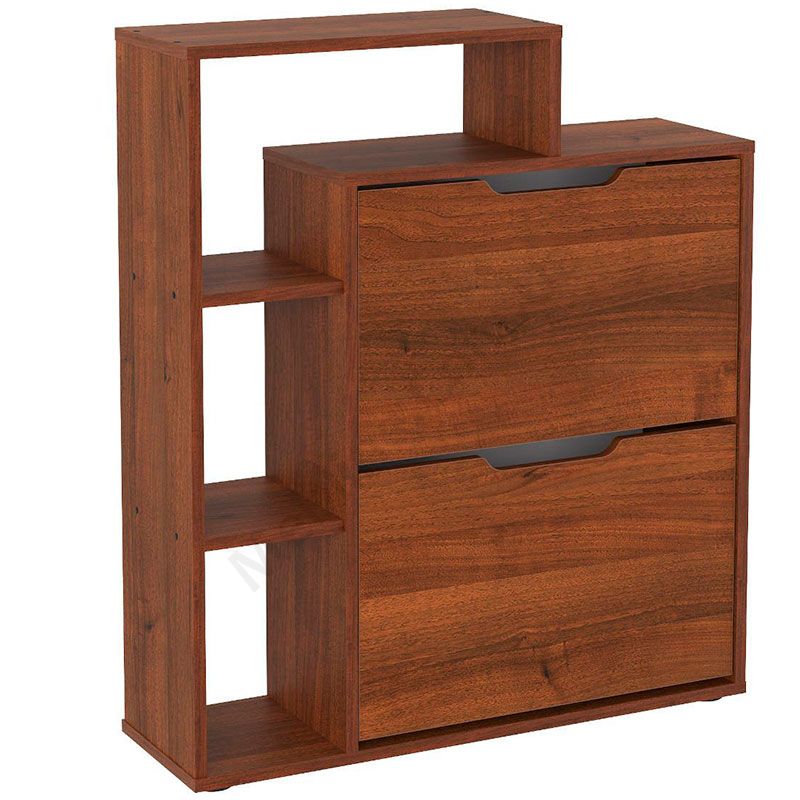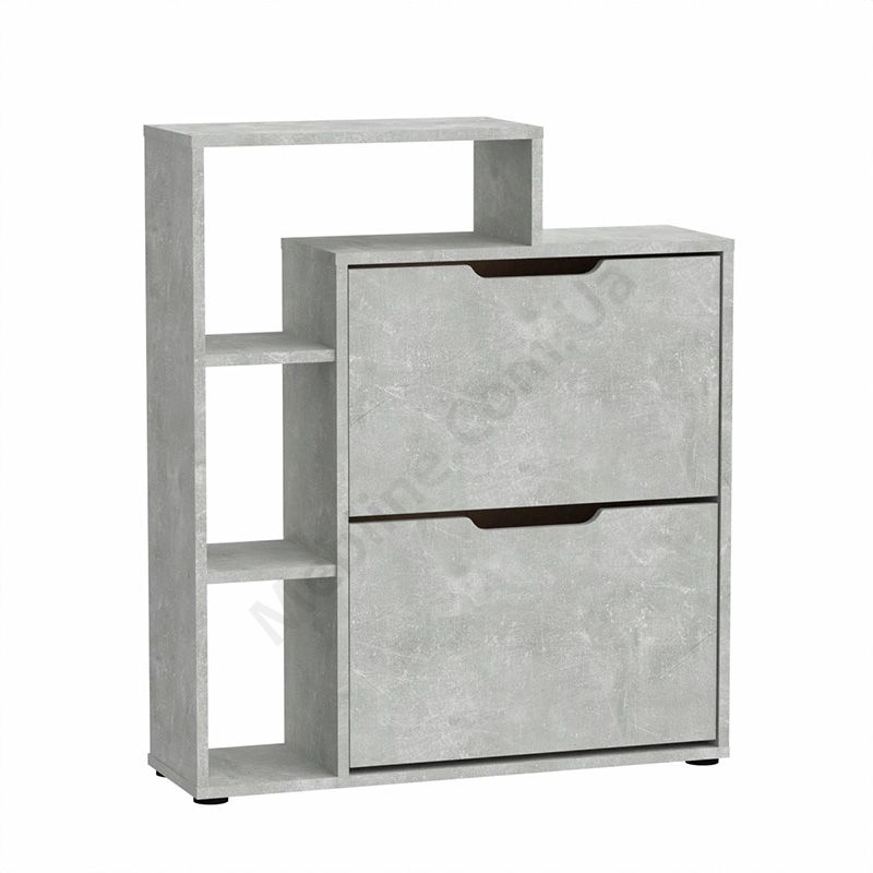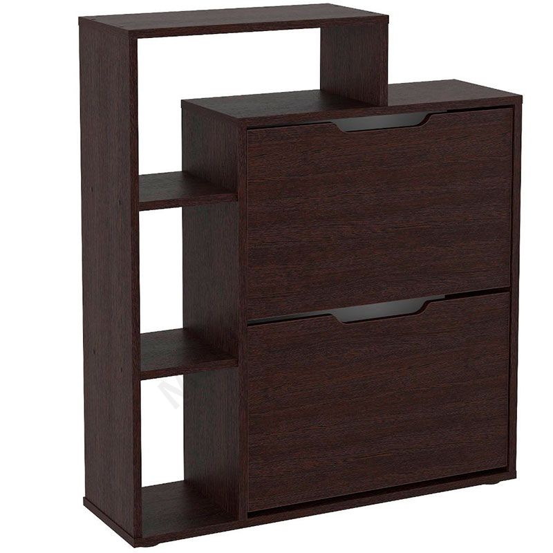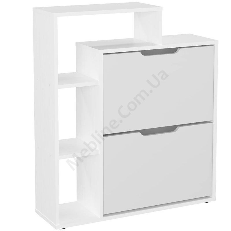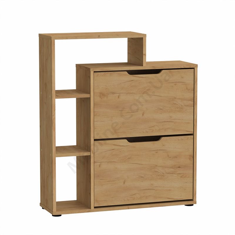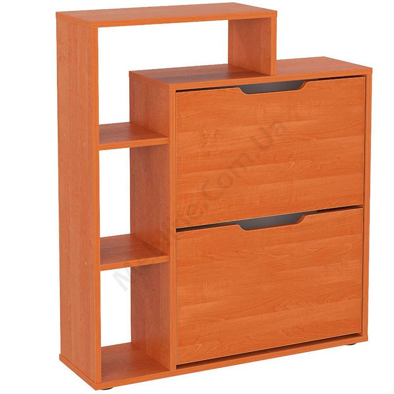 Тумба для взуття з двома дверцятами та відкритими поличками.