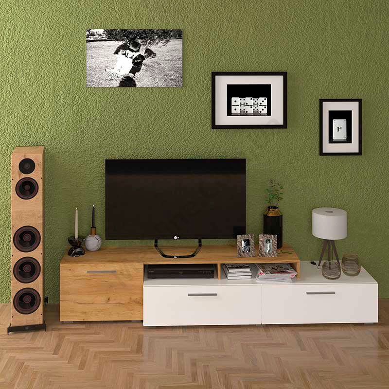 - Тумба з трьома відкидними дверцятами та відкритими секціями.