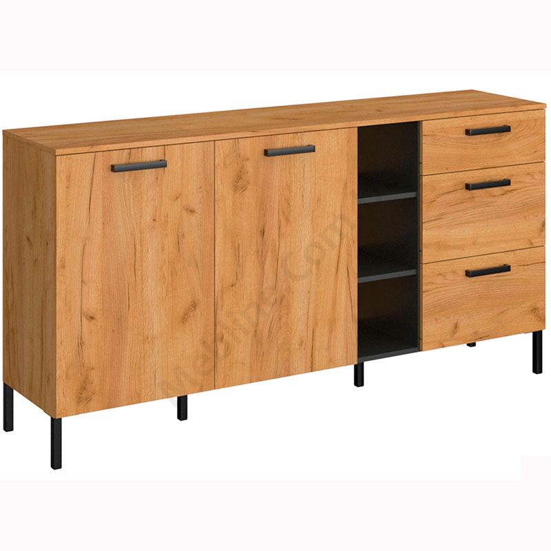 Комод з дверцятами, шухлядами та відкритими полицями.