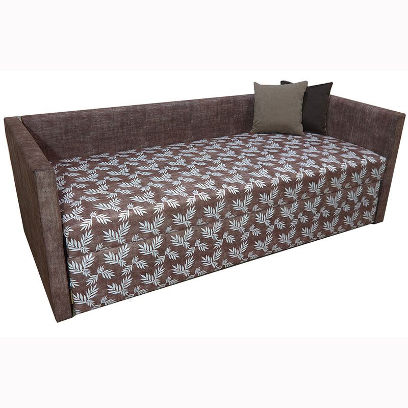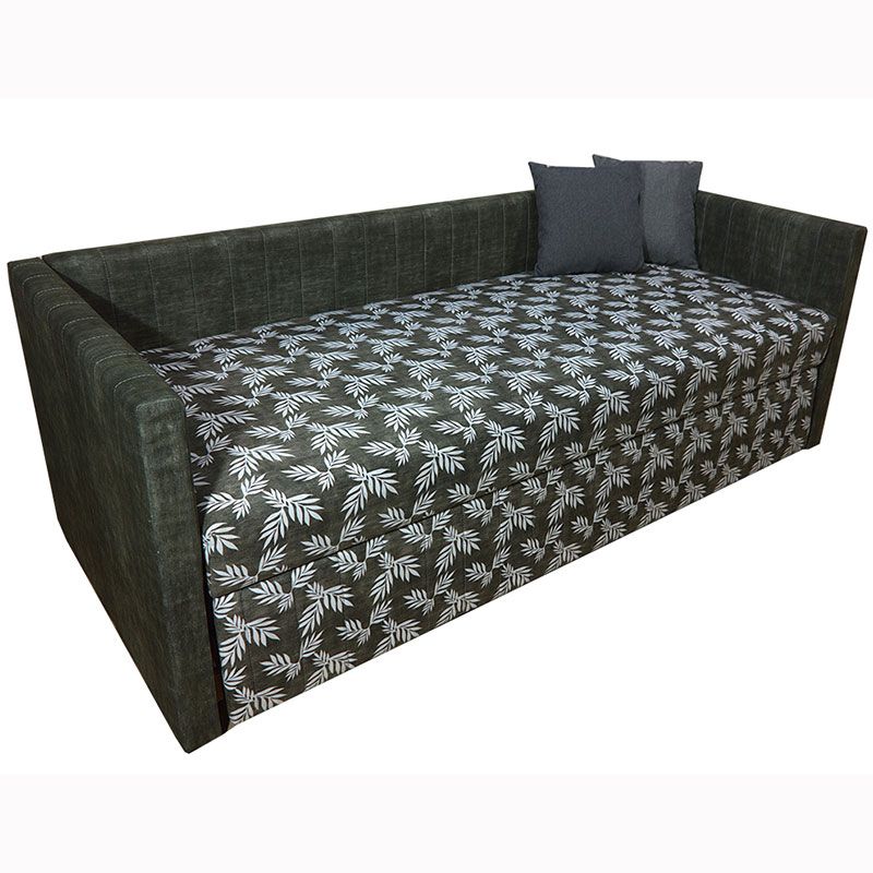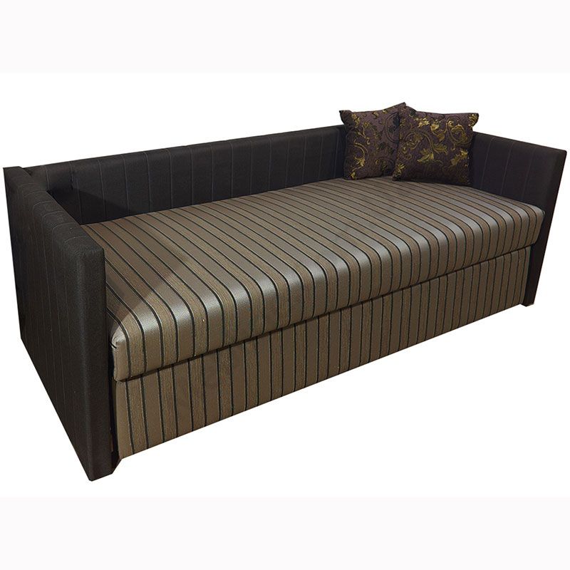 Прямий нерозкладний диван з підлокітниками та маленькими подушками.