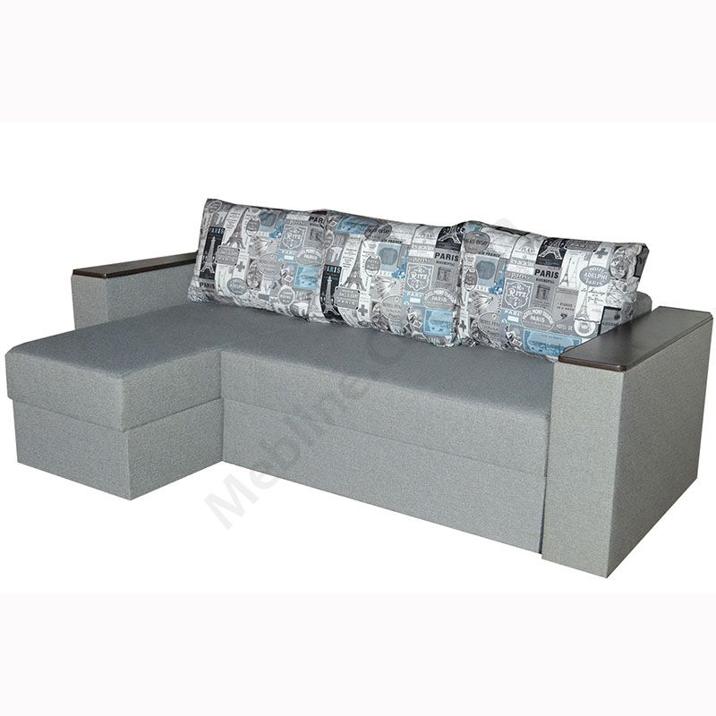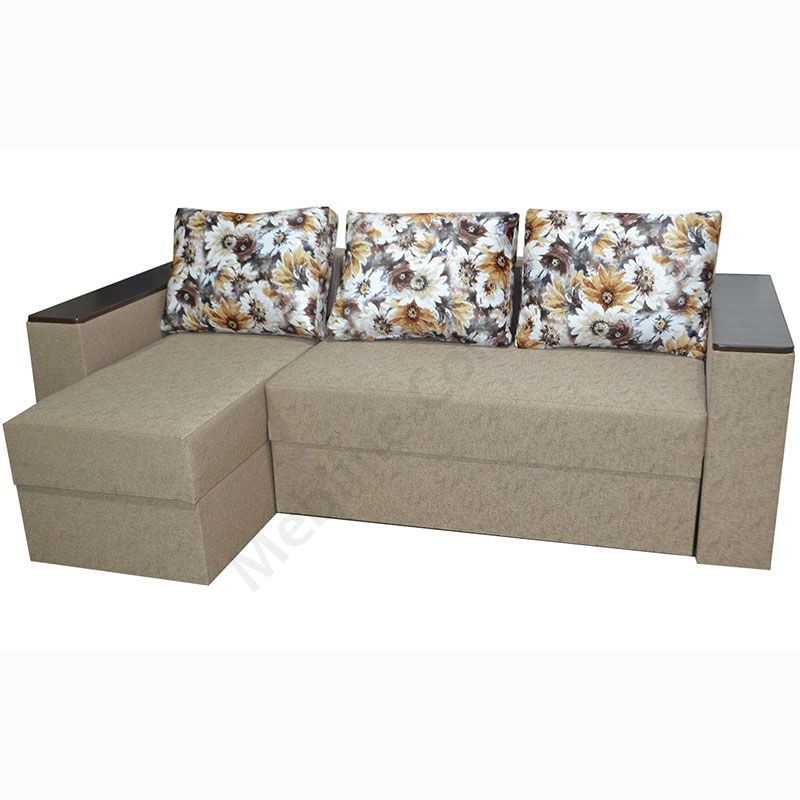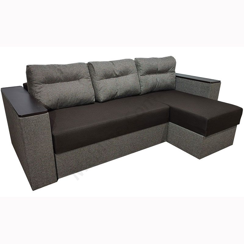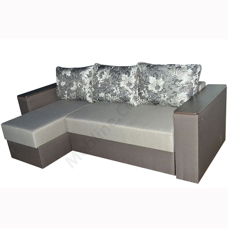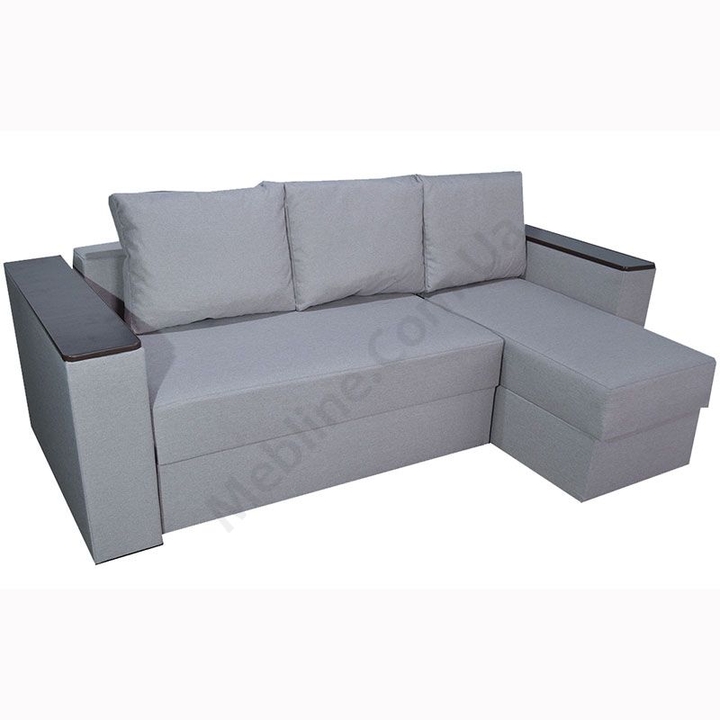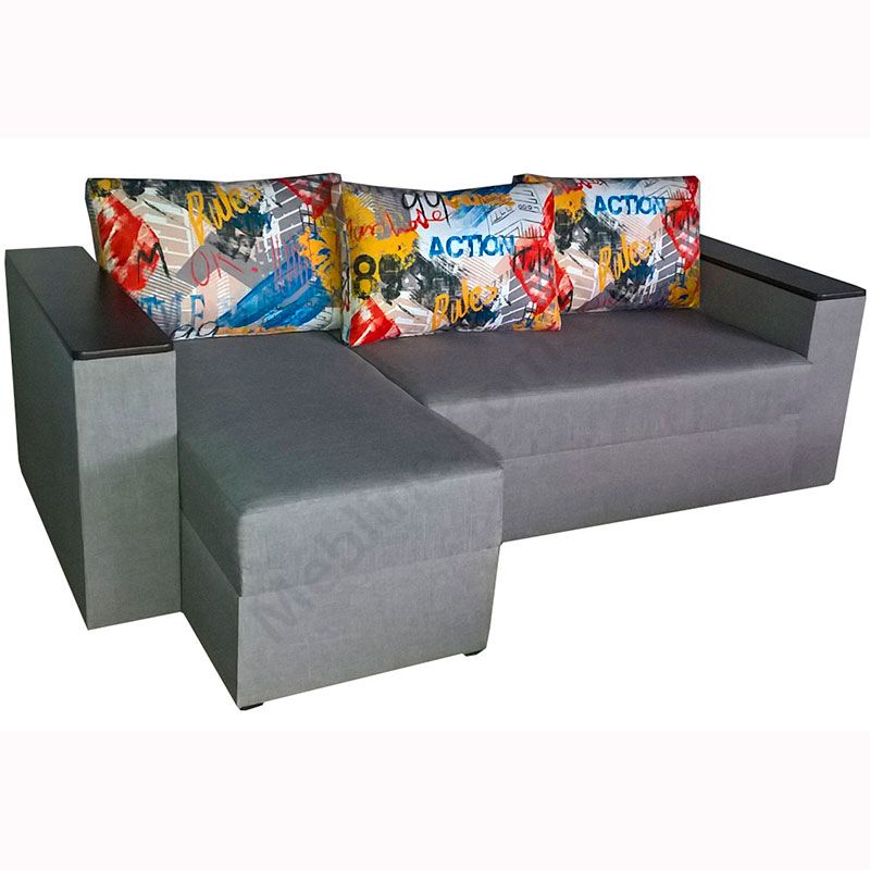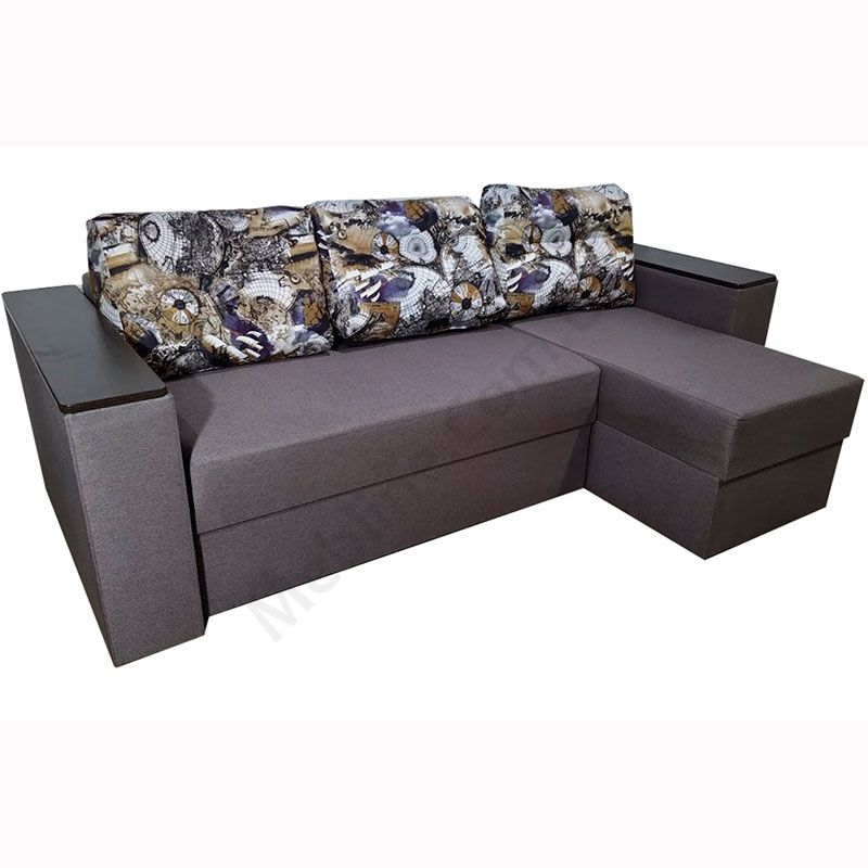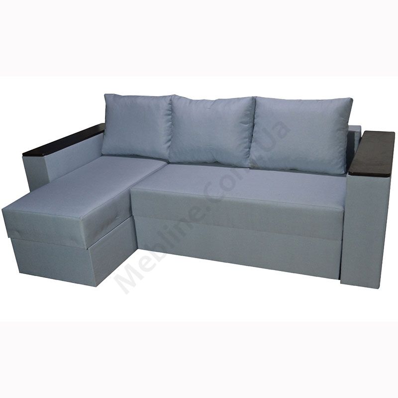 Кутовий розкладний диван з підлокітниками та м’якими подушками.