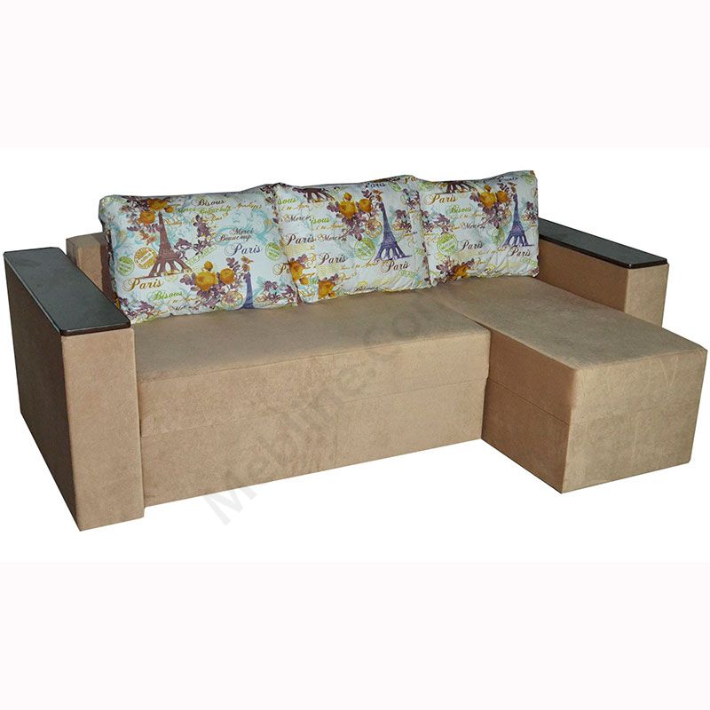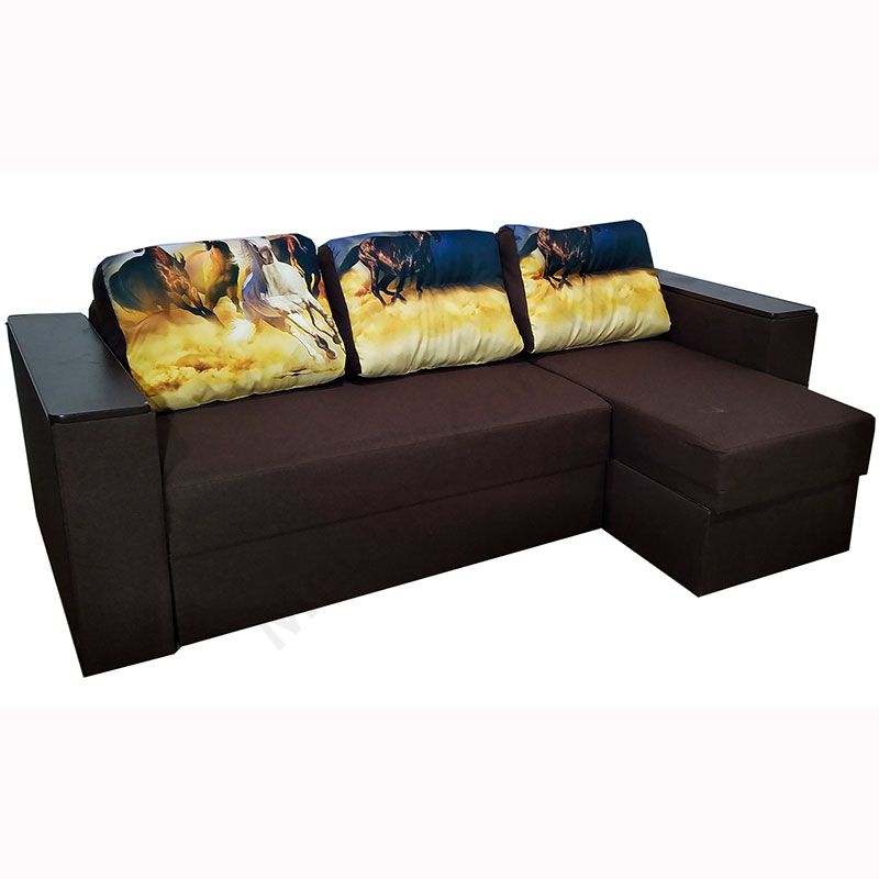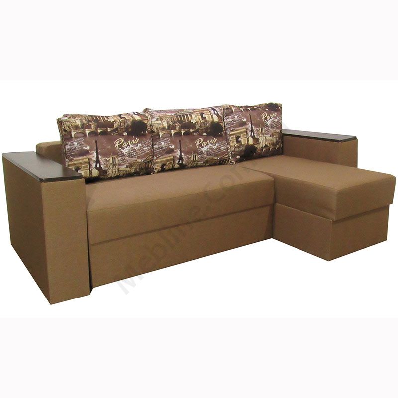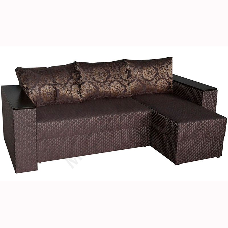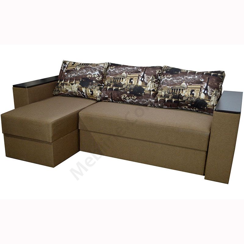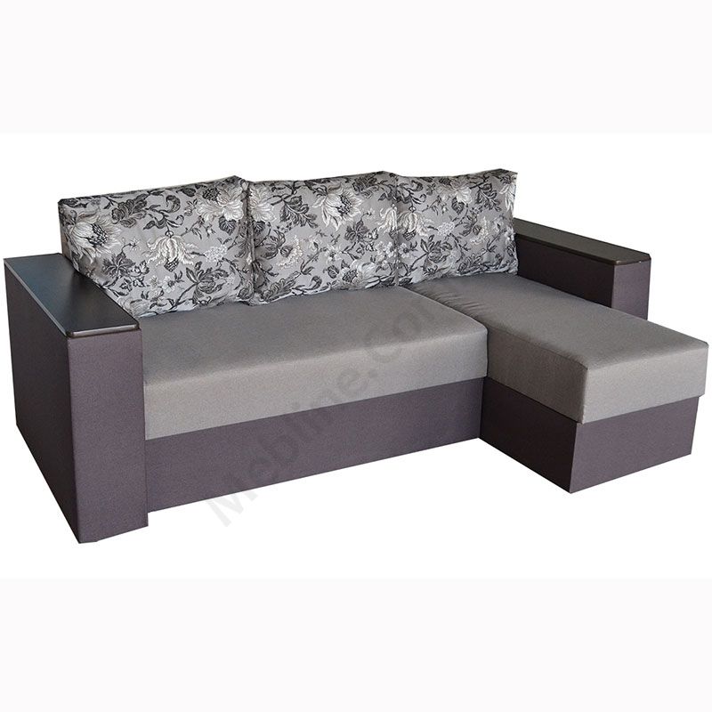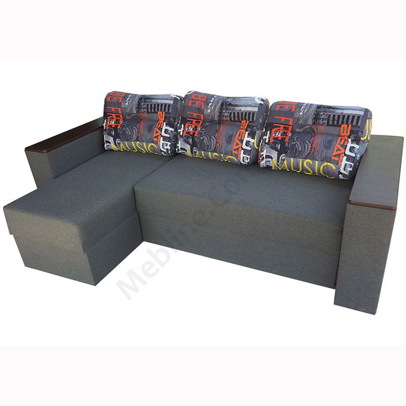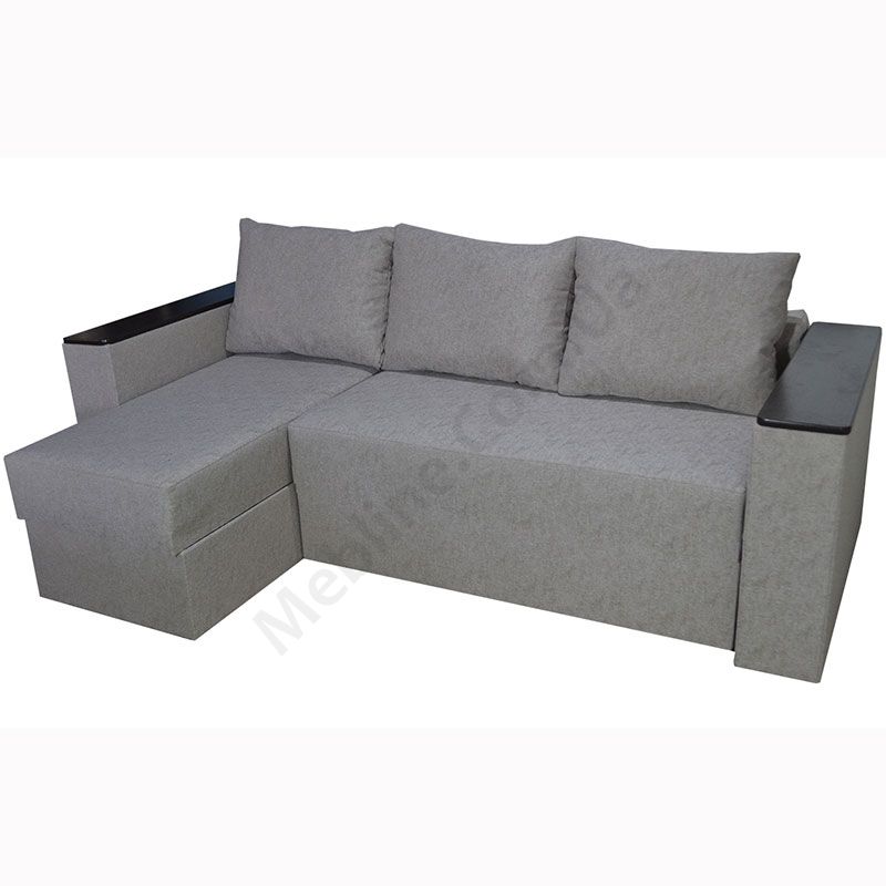 Кутовий розкладний диван з підлокітниками та м’якими подушками.