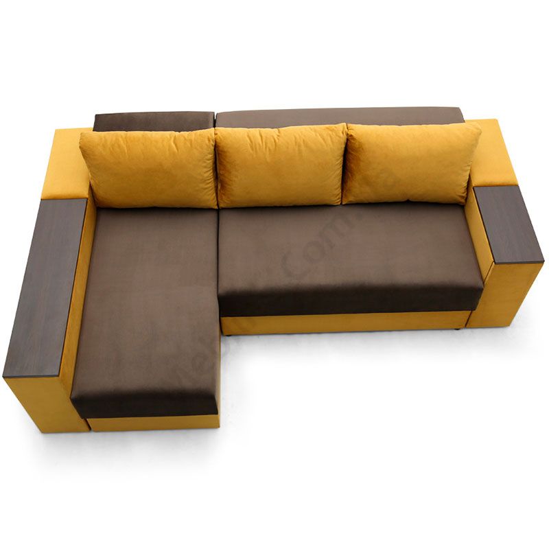 Розкладний кутовий диван з широкими підлокітниками з нішою та баром.