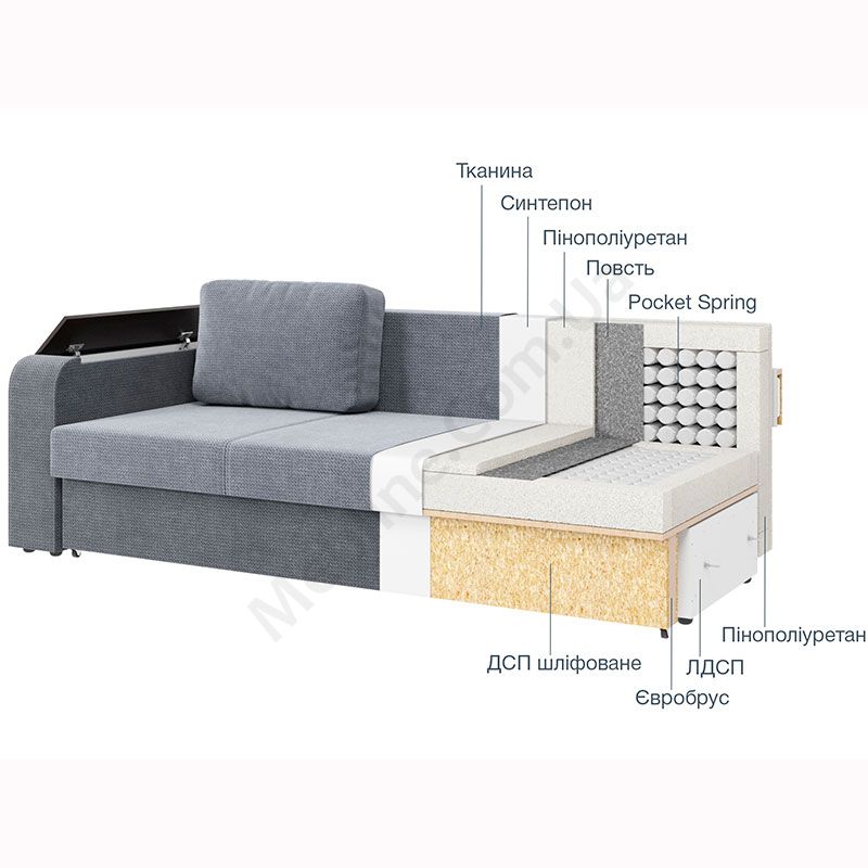 • Наповнення — пружинний блок Pocket Spring, повсть, пінополіуретан та синтепон.