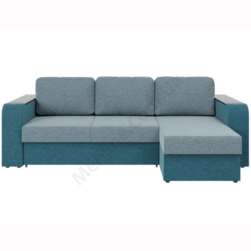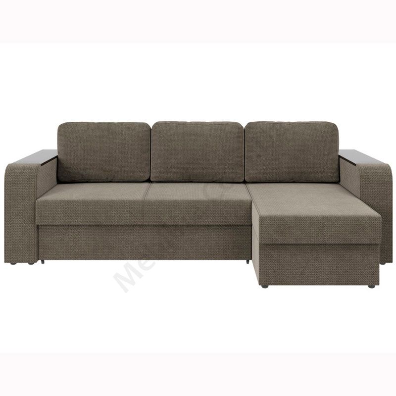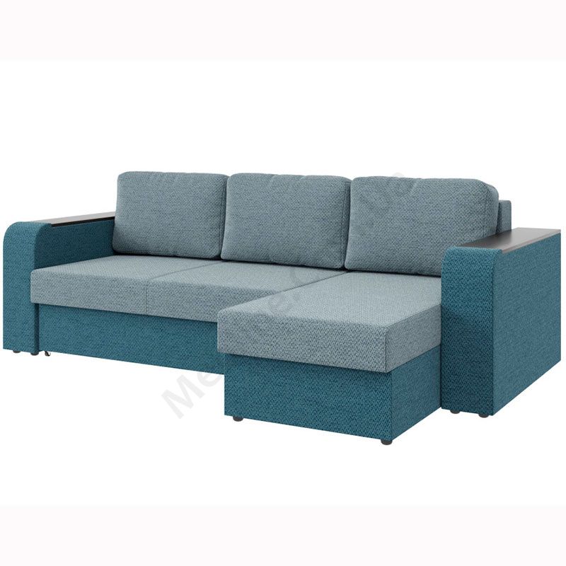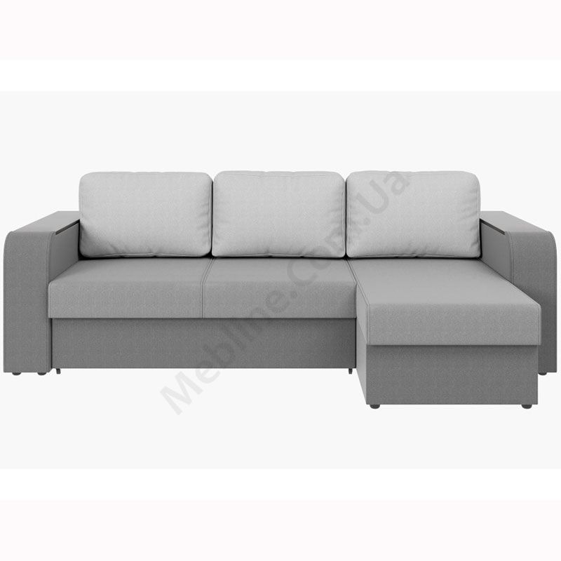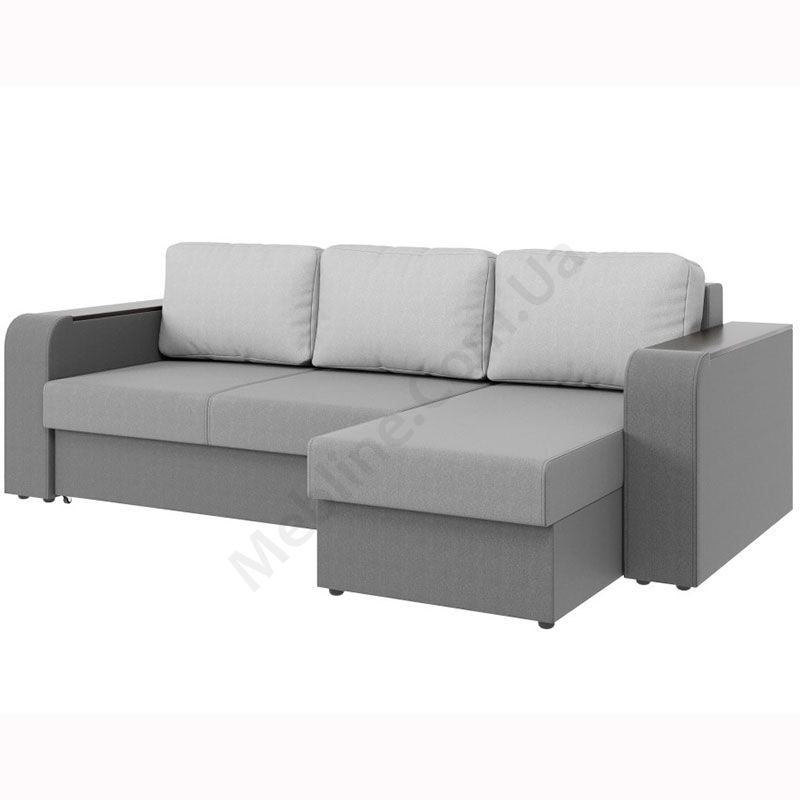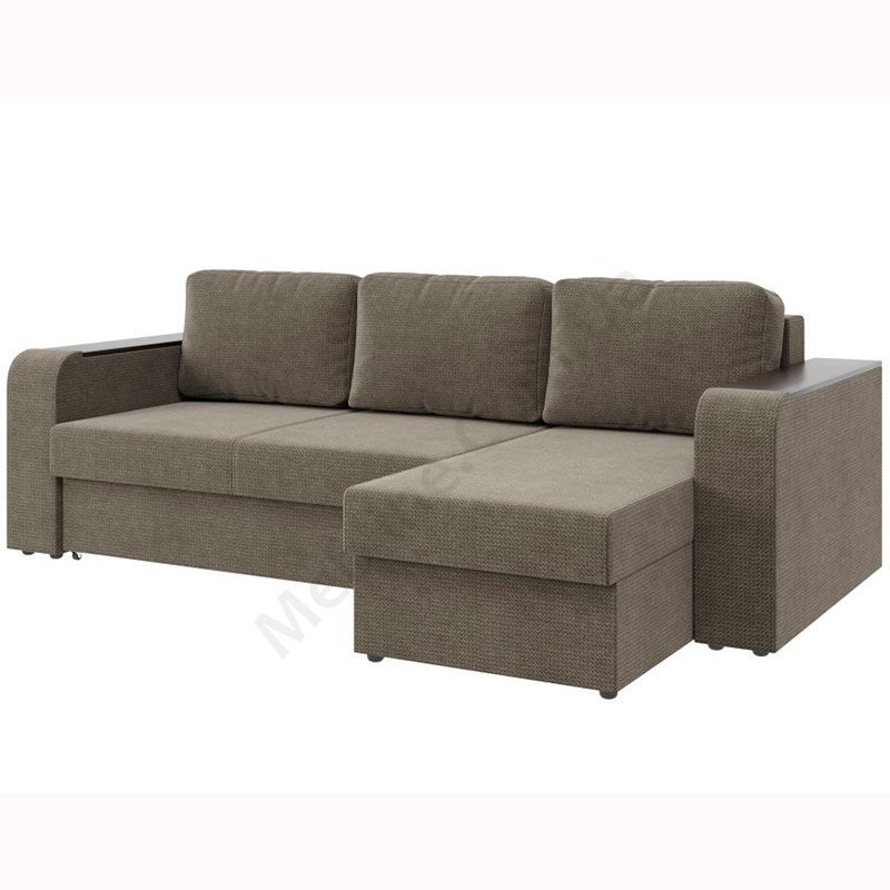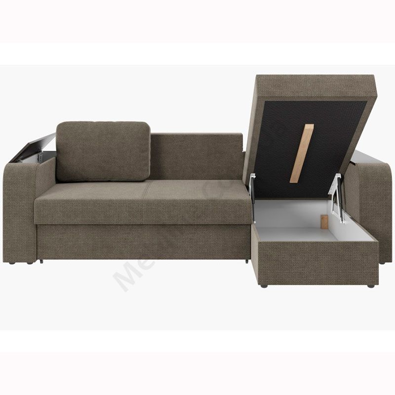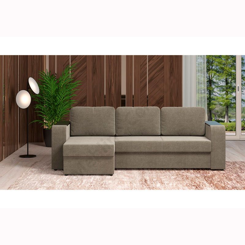 Розкладний кутовий диван з твердими широкими підлокітниками.