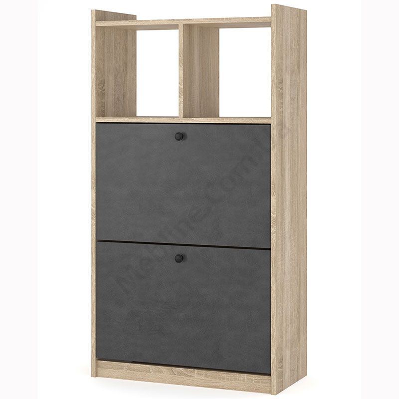 Тумба для взуття з двома відкидними дверима та відкритими полицями.