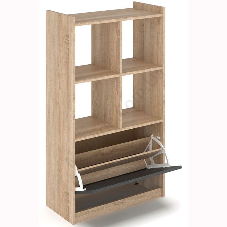 Тумба для взуття з відкидними дверима та відкритими полицями.
