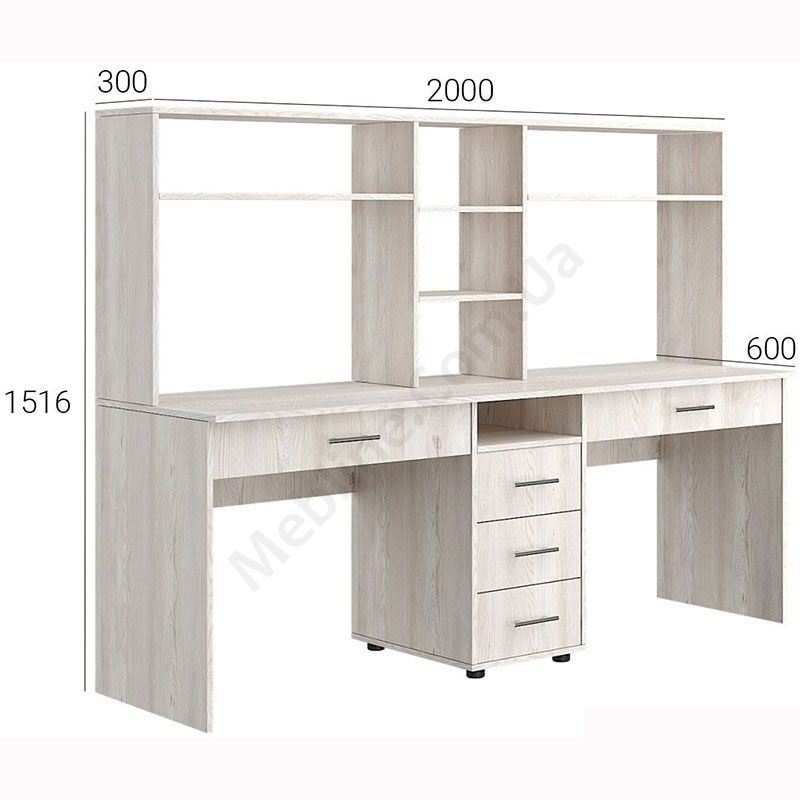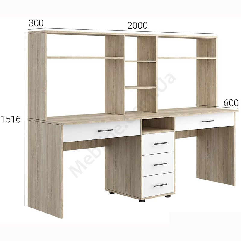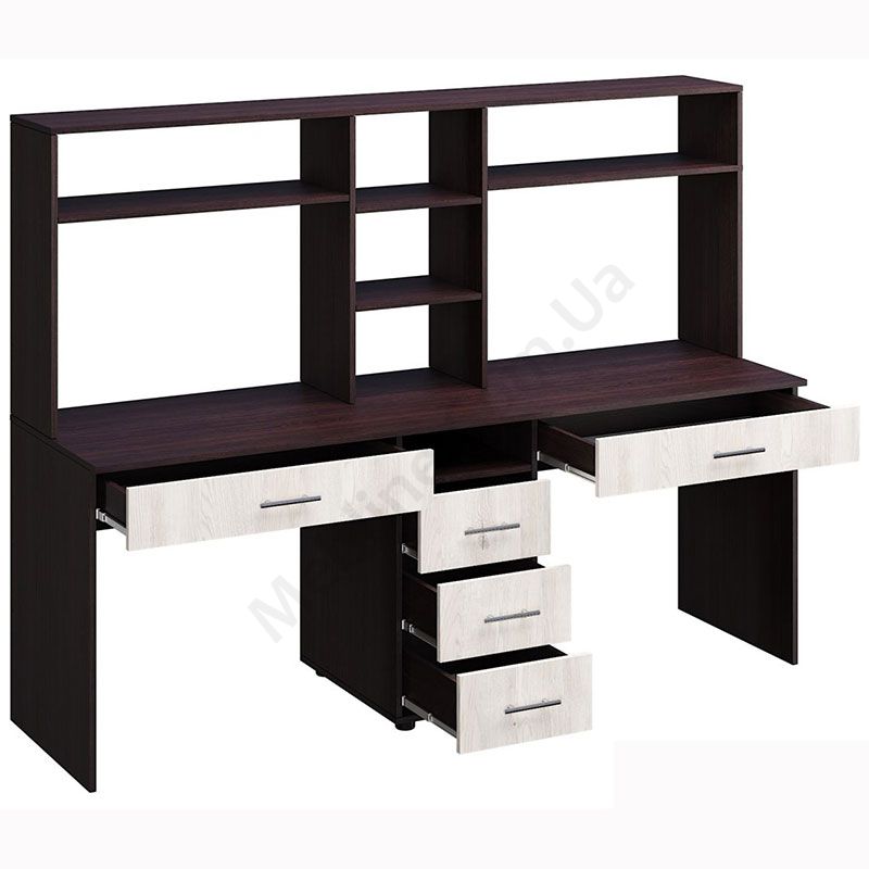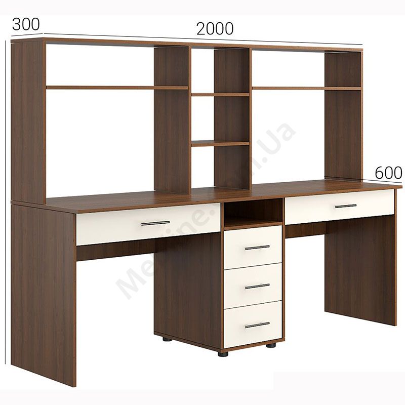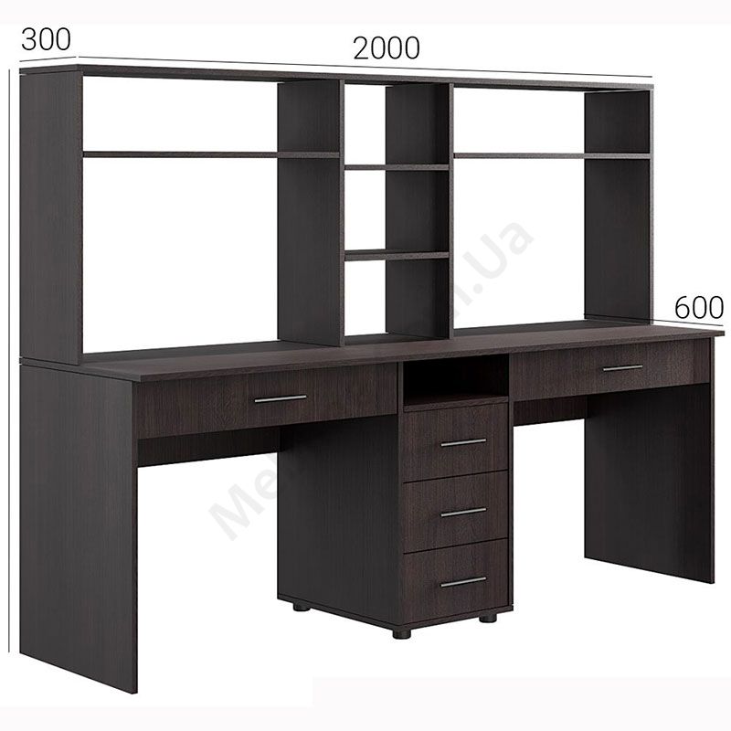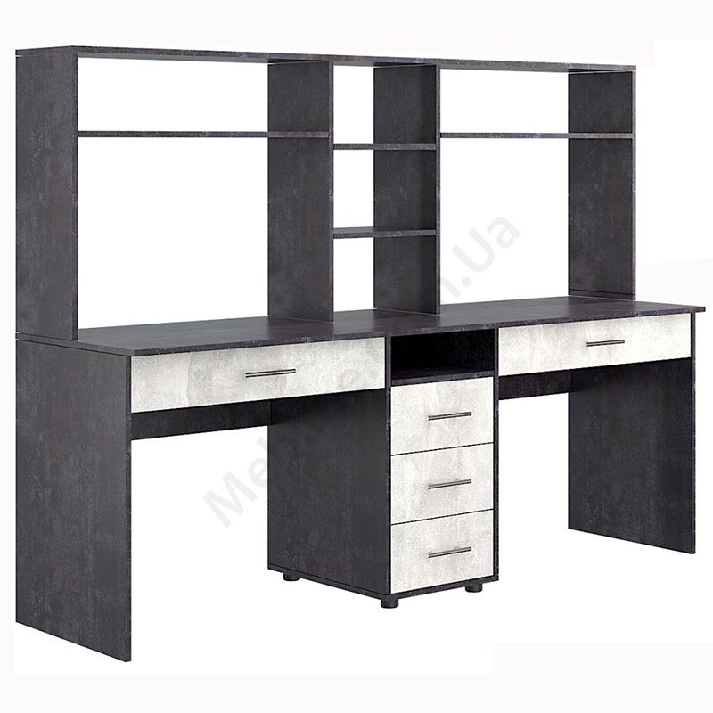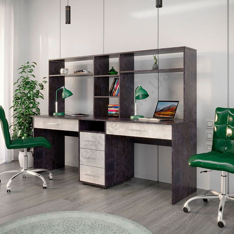 Подвійний комп’ютерний стіл з надставками та тумбою.