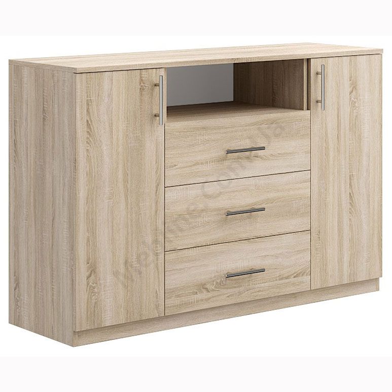 Комод з висувними шухлядами, дверцятами та відкритою секцією.