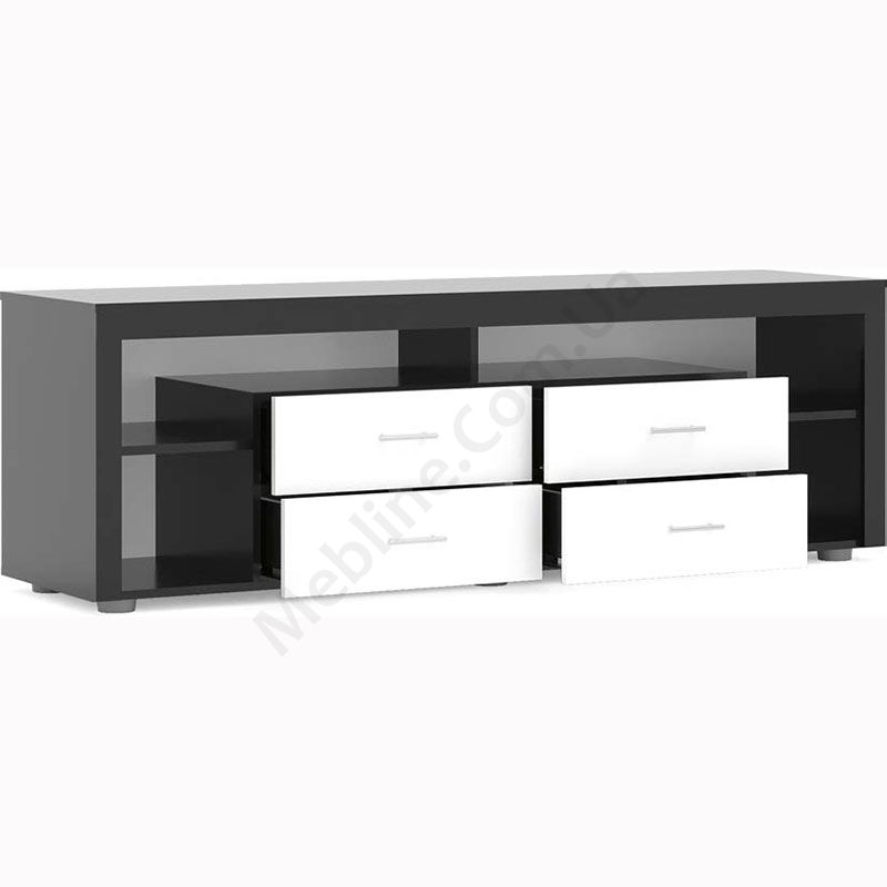 Тумба під телевізор з висувними шухлядами та відкритими секціями.
