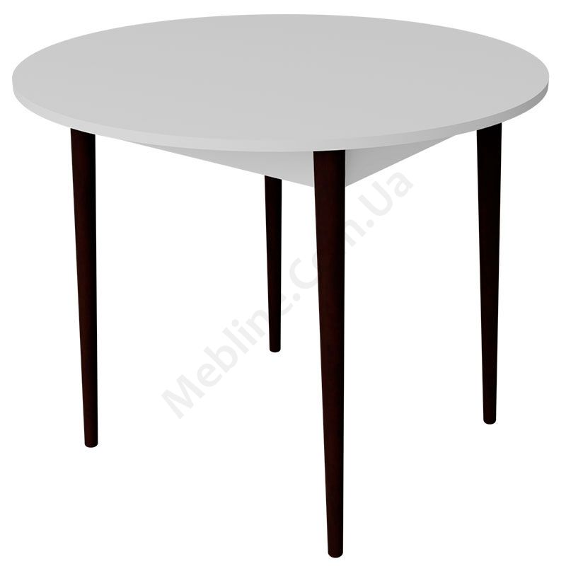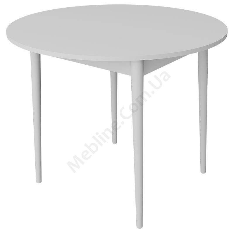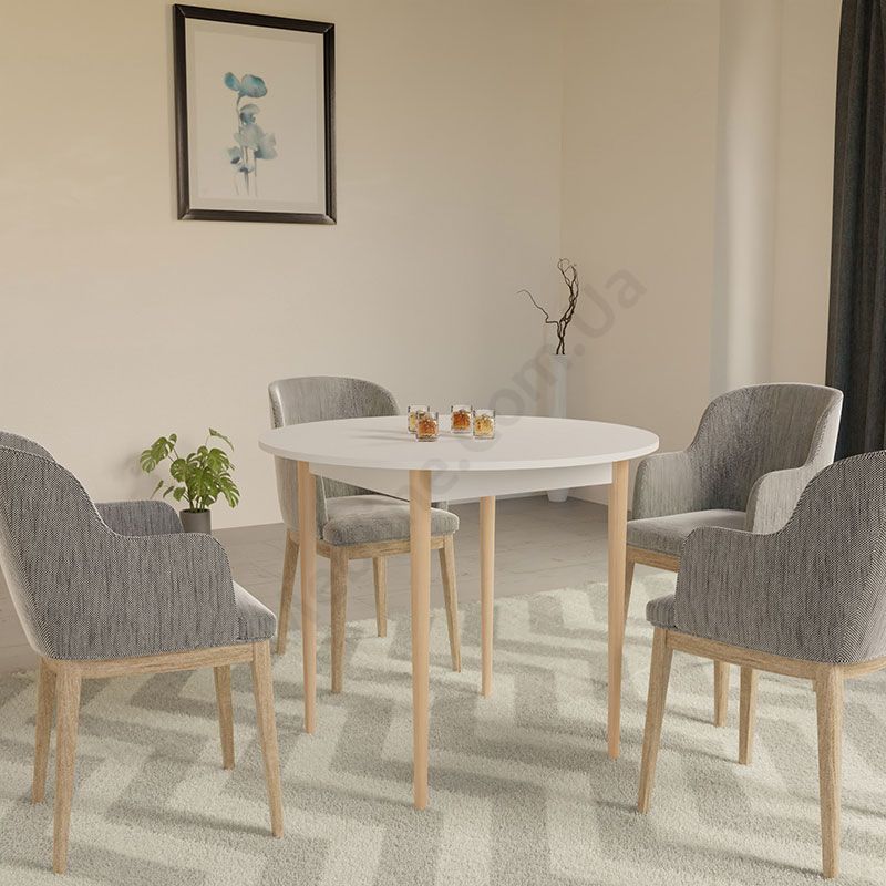 Круглий нерозкладний обідній стіл на чотирьох ніжках.
