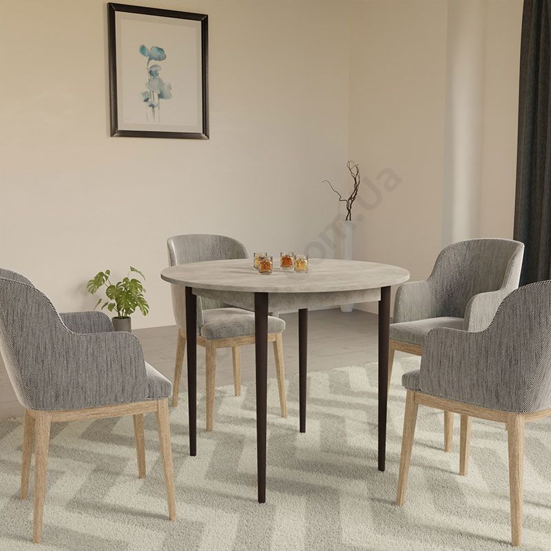 Круглий нерозкладний обідній стіл на чотирьох ніжках.