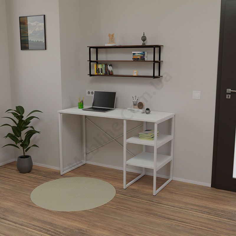 Комп’ютерний стіл на металевій основі з полицями.