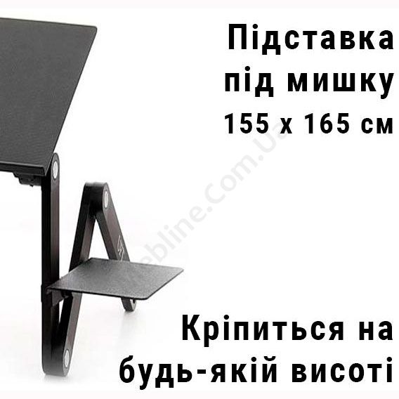 - На ніжку столика на будь-якій висоті кріпиться зручна підставка для миші.