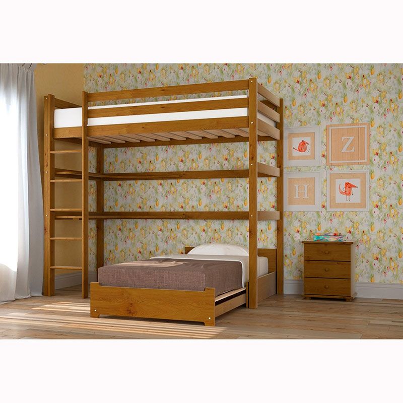 Дитяче двоярусне ліжко з натурального дерева із захисним бортиком та сходами.
