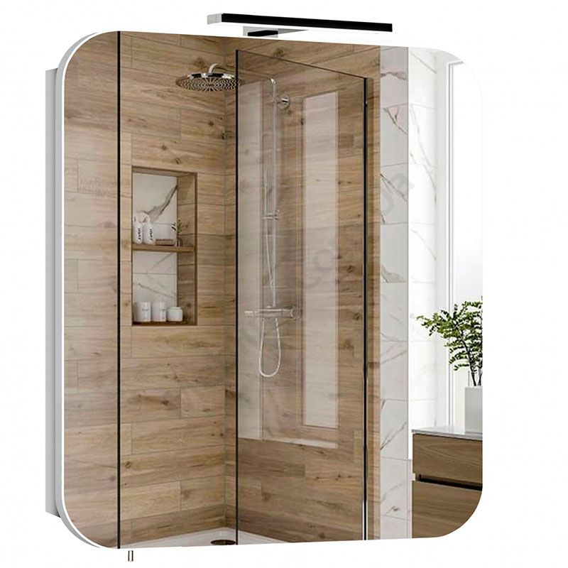 Навісна дзеркальна шафка для ванної кімнати з підсвічуванням та полицями всередині.