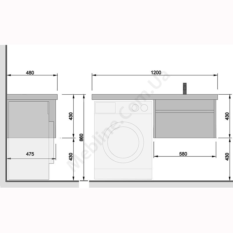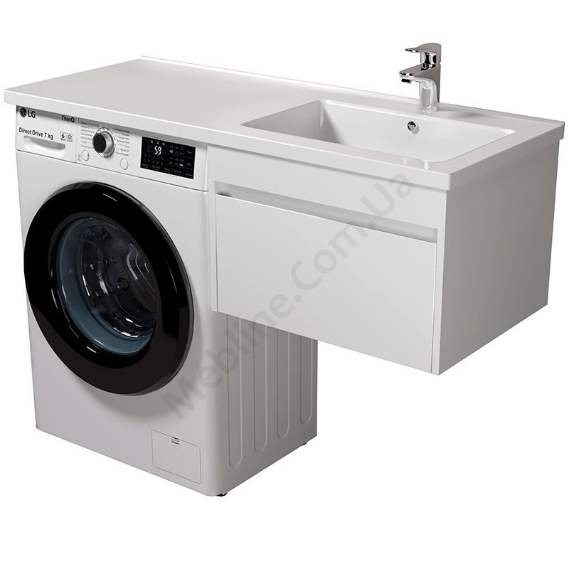 Підвісна тумба для ванної зі стільницею над пральною машинкою та з умивальником.