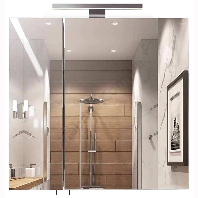 Навісна дзеркальна шафка для ванної кімнати з підсвічуванням та полицями всередині.