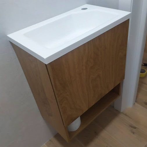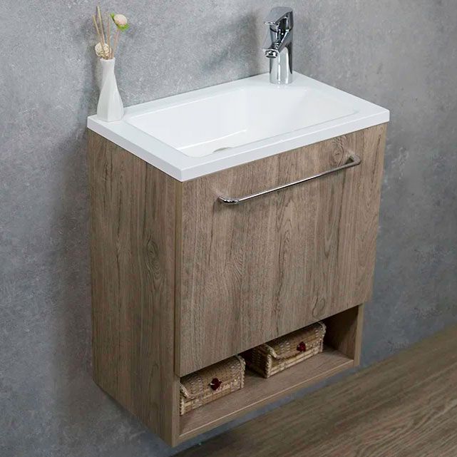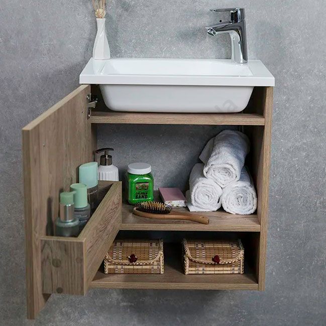 Навісна тумба для ванної з умивальником, полицею та дверцятами.
