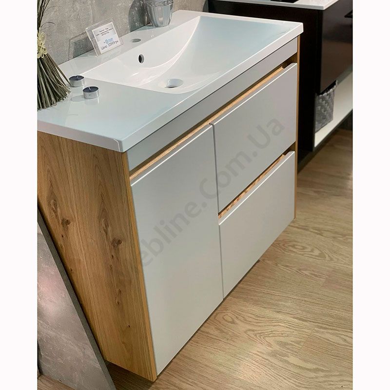 Навісна тумба для ванної з умивальником, дверцятами та висувними шухлядами.