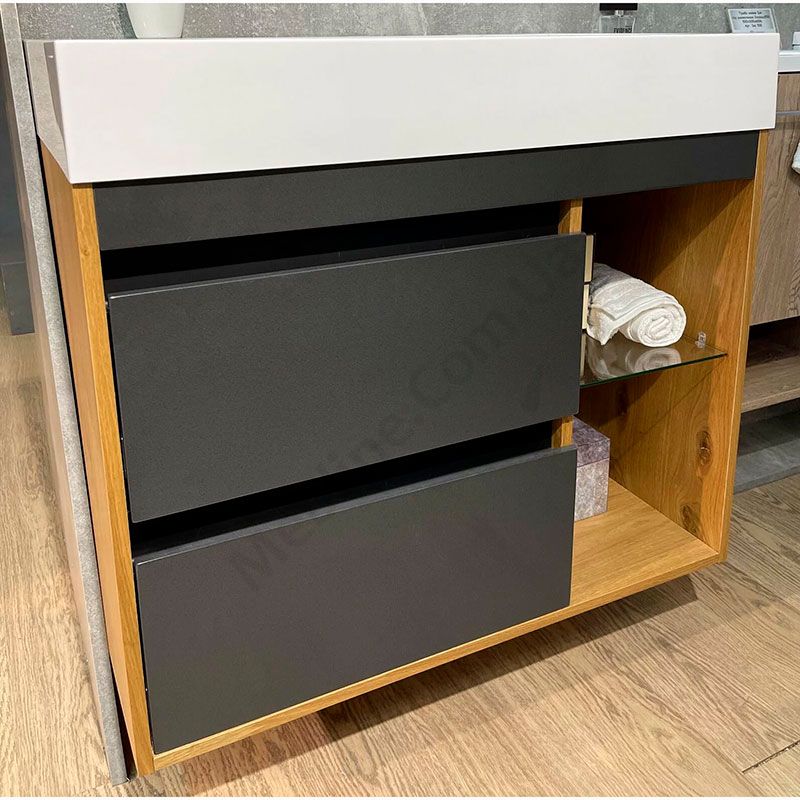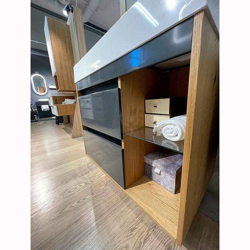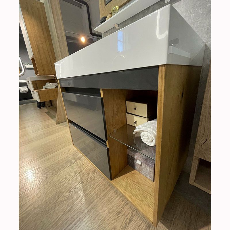 Навісна шафка для ванної з умивальником, висувними шухлядами та поличками.