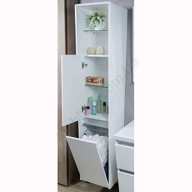 Навісний пенал для ванної кімнати з корзиною для білизни та поличками.