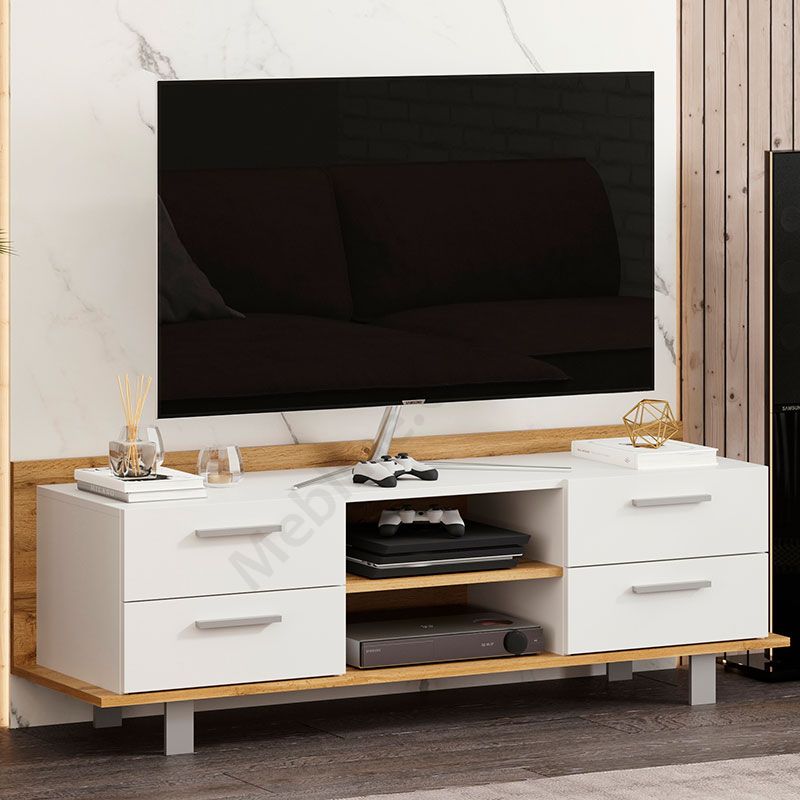Тумба під телевізор з висувними шухлядами та відкритими секціями.