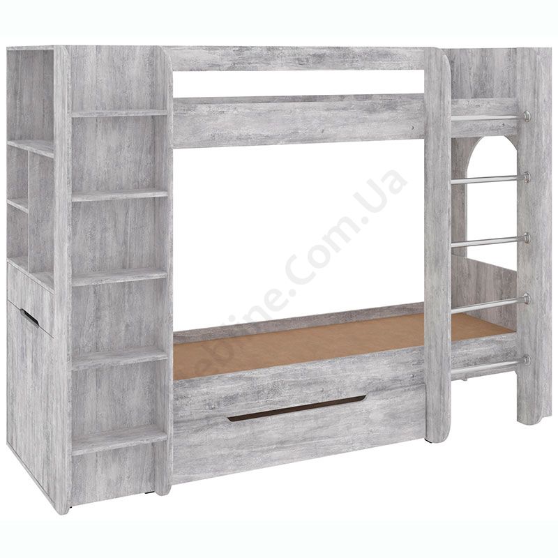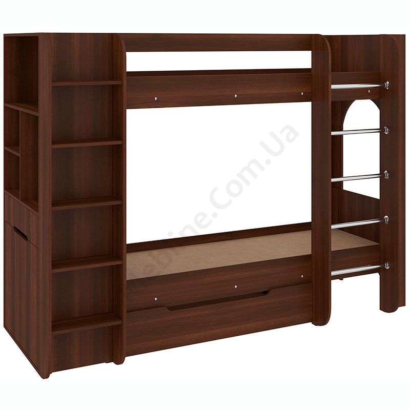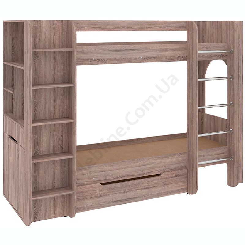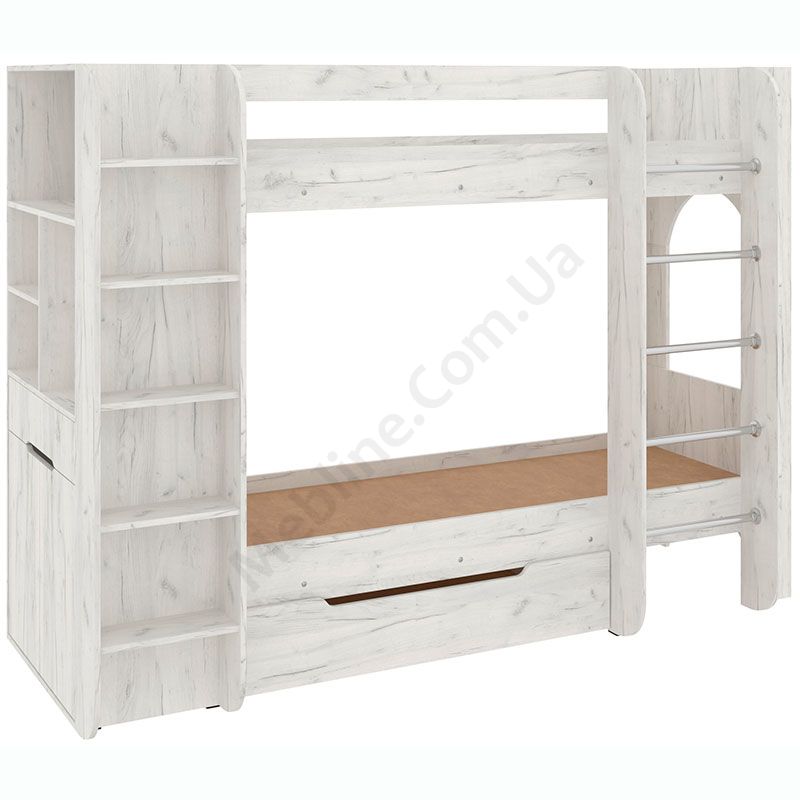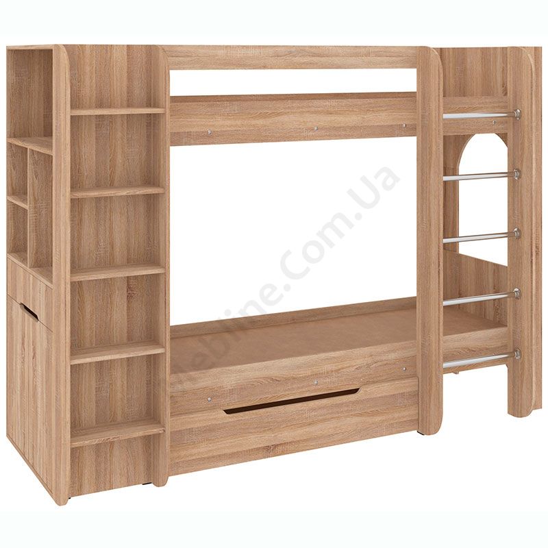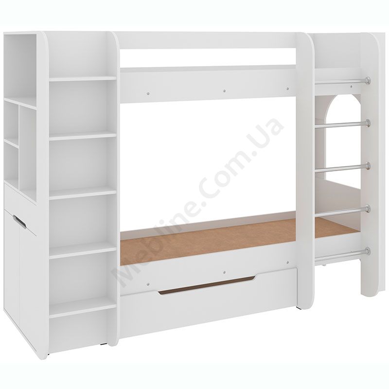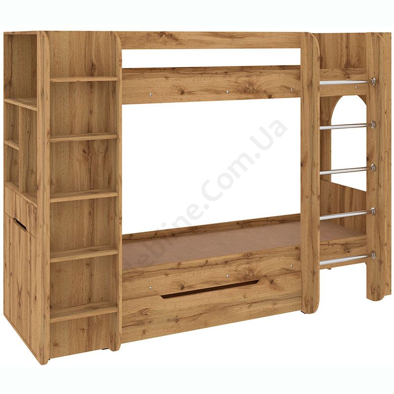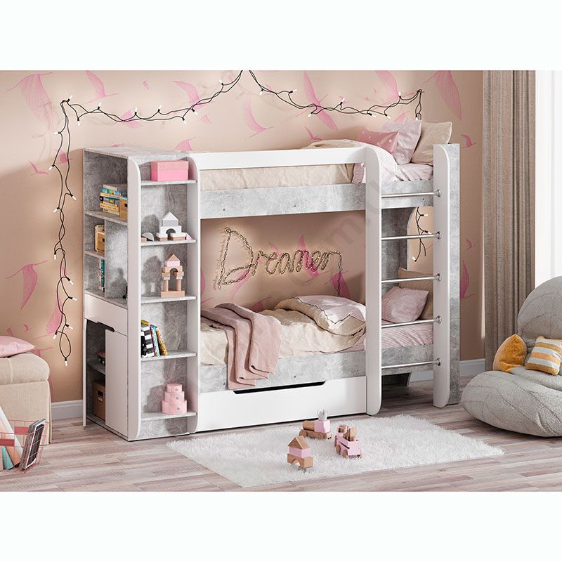 Двох’ярусне ліжко зі стелажами, шафкою та шухлядою для зберігання.