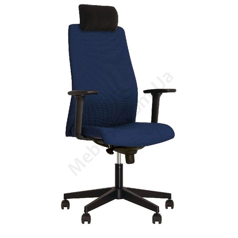 Крісло для керівника в лаконічному стилі, пластиковим регульованими підлокітниками, регульованим підголівником, синхромеханізмом, фіксацією в 5 положеннях, на пластиковій основі.
