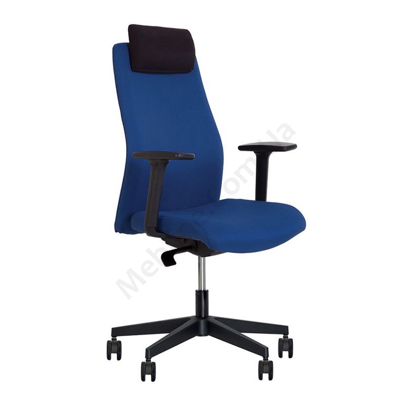 Крісло для керівника в лаконічному стилі, пластиковим регульованими підлокітниками, регульованим підголівником, синхромеханізмом, фіксацією у 3 положеннях, на пластиковій основі.