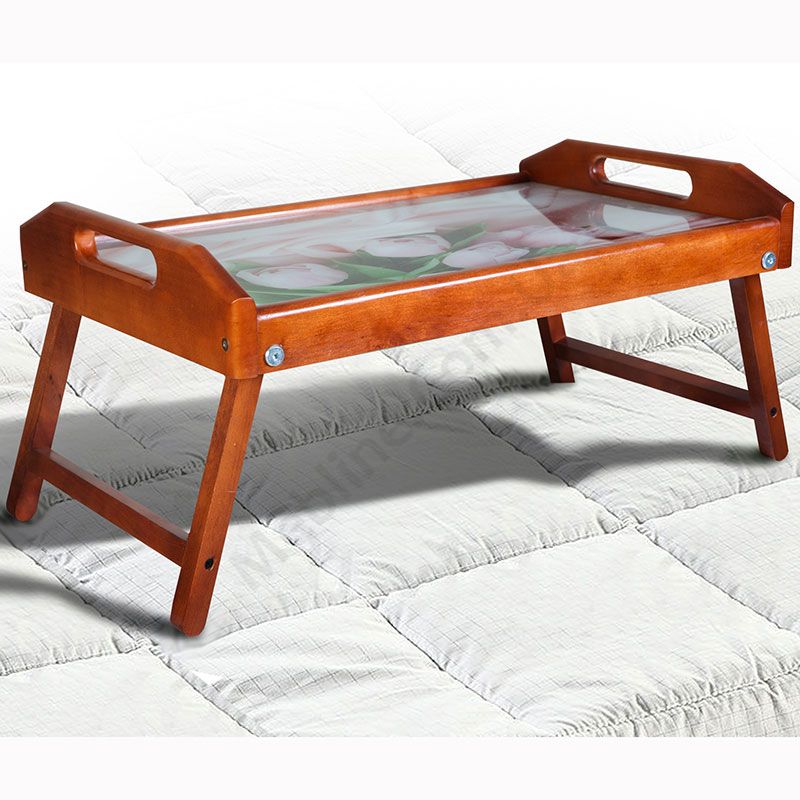 Дерев’яний столик для сніданку зі скляною стільницею.