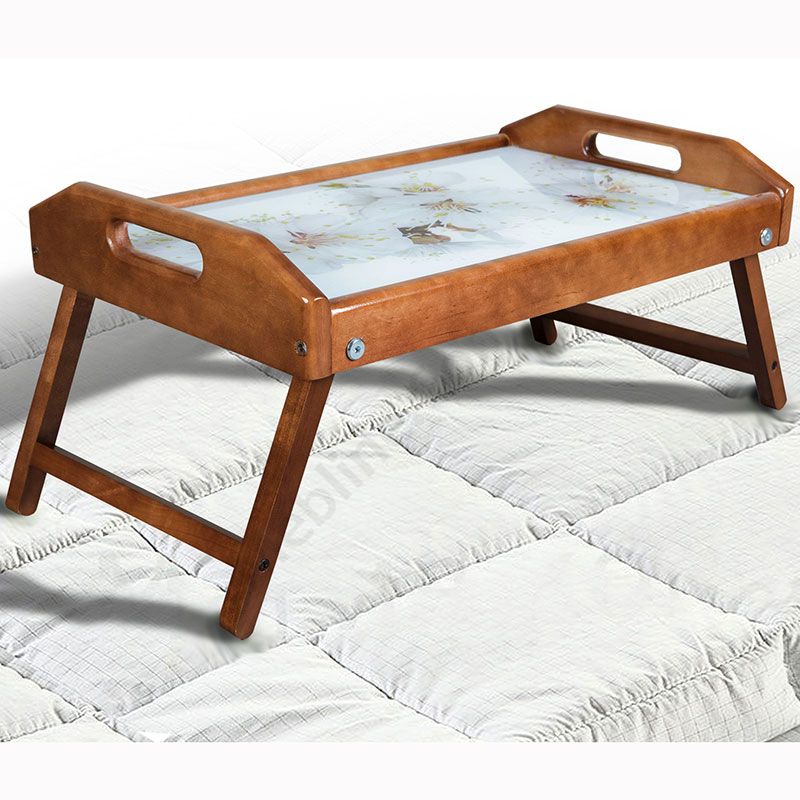 Дерев’яний столик для сніданку зі скляною стільницею.