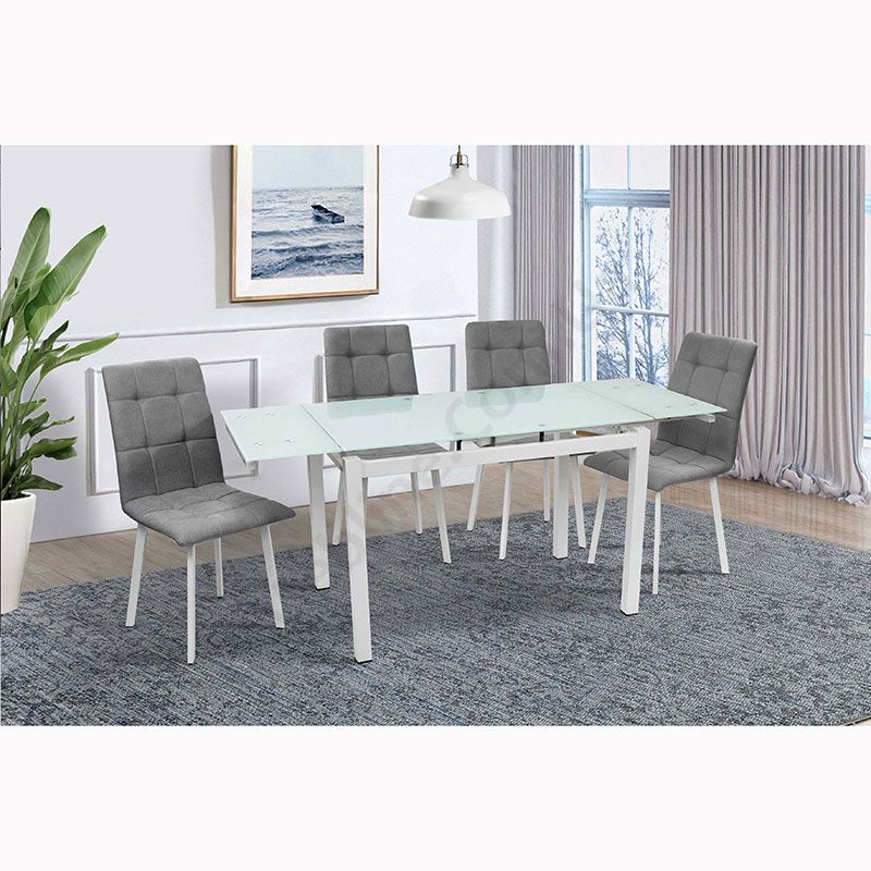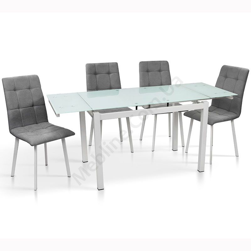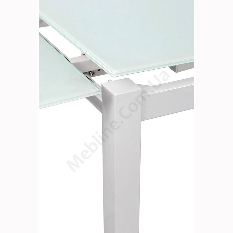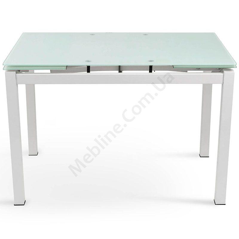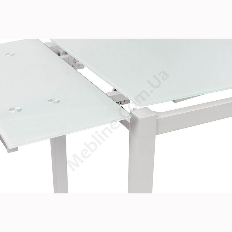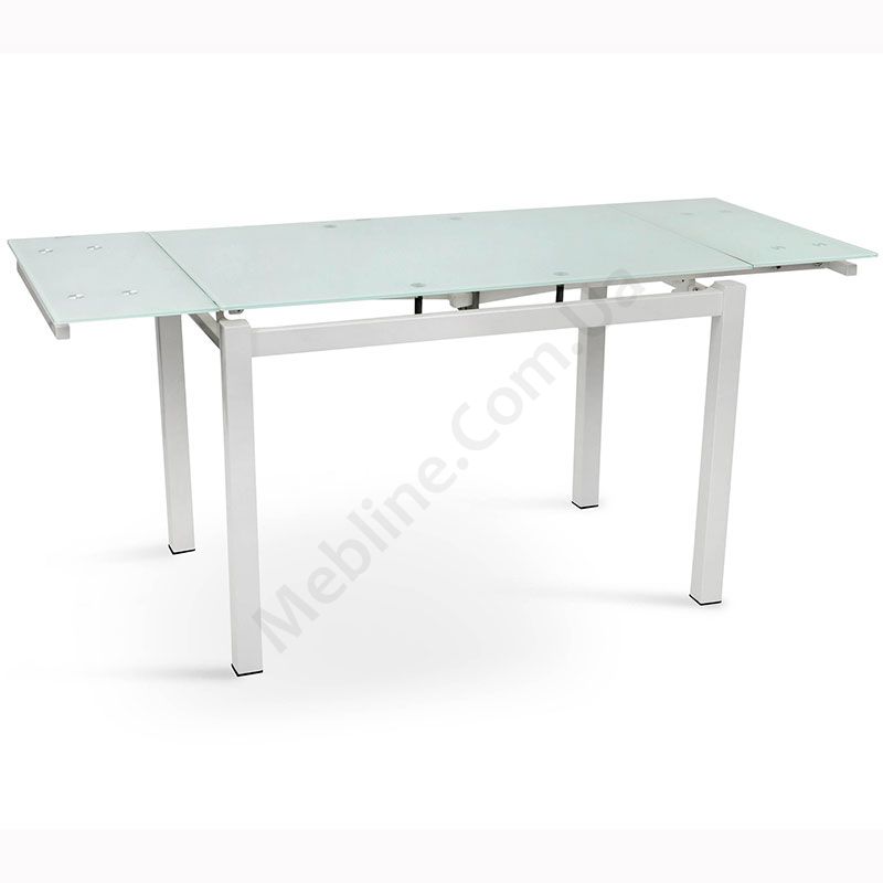 Розкладний обідній стіл зі скляною стільницею на металевих ніжках.
