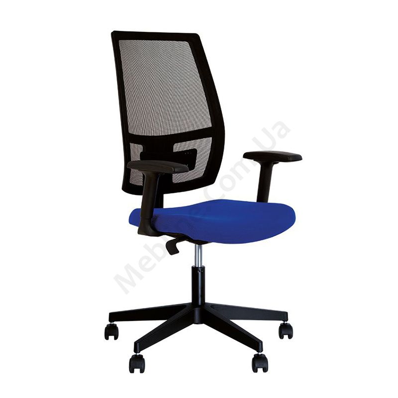 Комп’ютерне поворотне крісло з широкою сітчастою спинкою, регульованими пластиковими підлокітниками, чорними пластиковими елементами, фіксацією у 3 положеннях, на пластиковій основі.